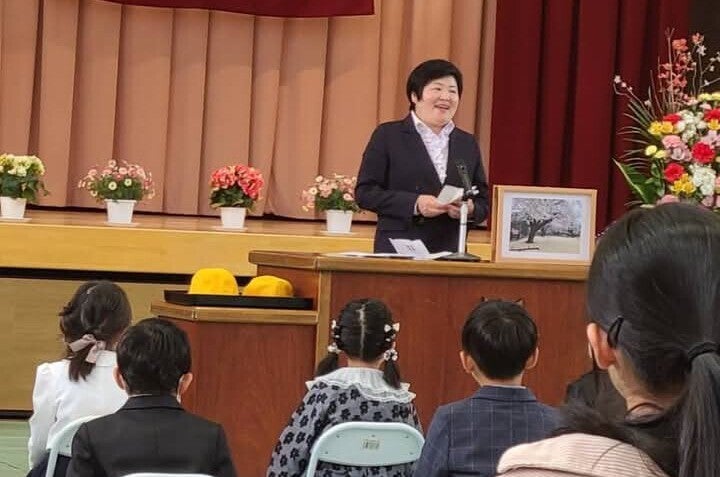 PTA会長(昨年度)として挨拶する 丸一仙花