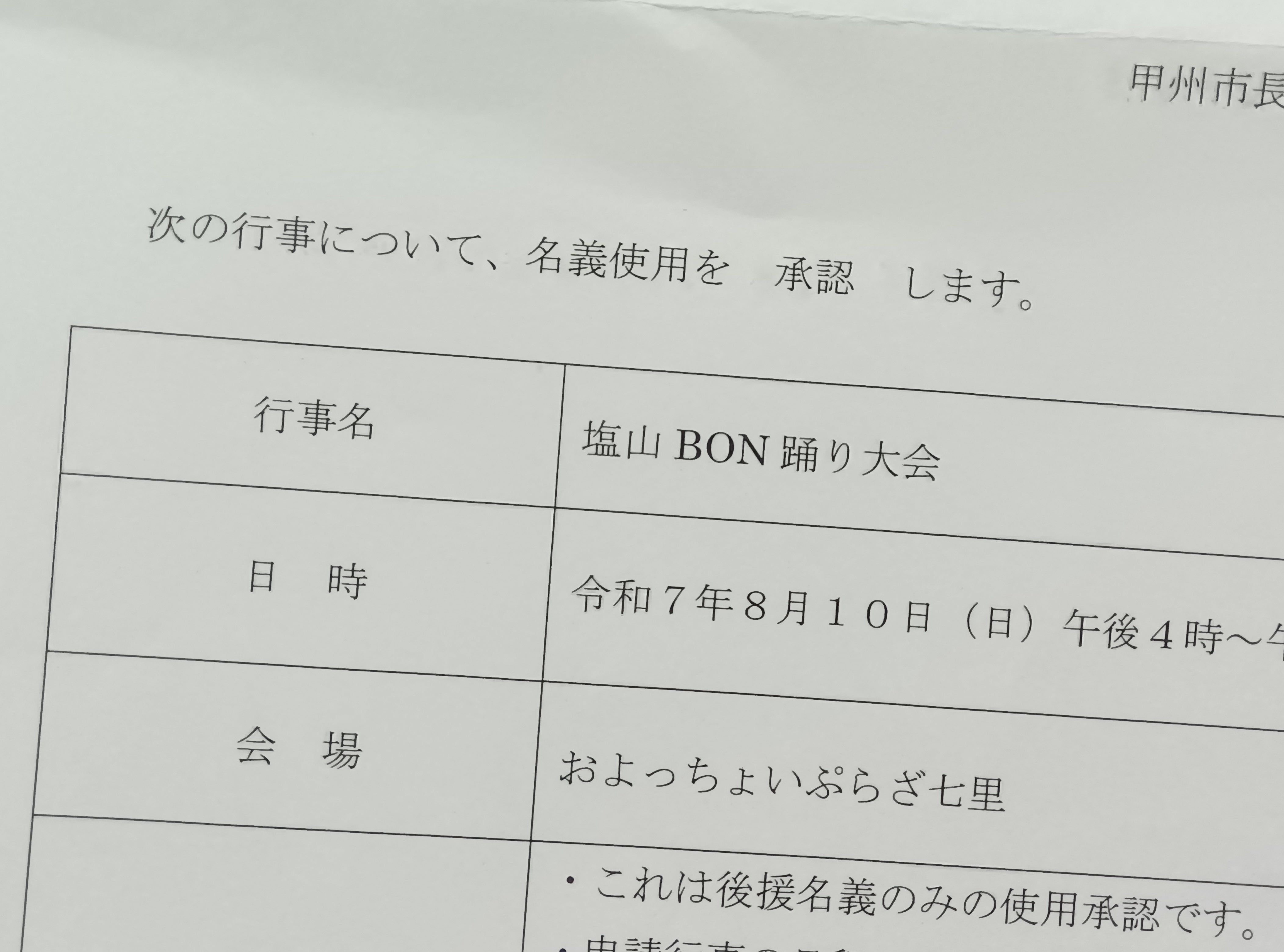 甲州市からの「後援名義使用承認通知書」〈ステージ出演者、飲食・物販 出店者について〉