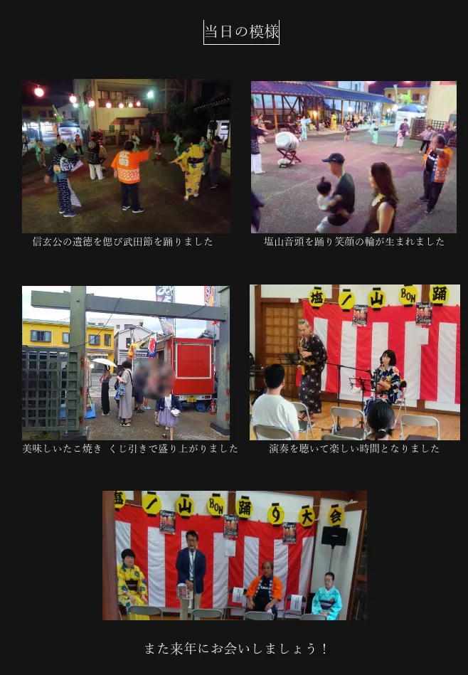2025/08/15 18:57「塩ノ山BON踊り大会」(およっちょいぷらざ七里)は、お陰様で100名以上のご来場で、大成功となりましたステージショーでは ぶどう様、あこそど様に、演奏&歌唱して頂き、花を添えて下さいました。屋台は、フード研究所 縁 様、KEY 様に美味しい料理を、はいから屋 様に、楽しいくじ引きをご提供頂き、とても喜ばれました。盆踊りでは、甲州市文化協会舞踊部 の皆様にご指導頂き、太鼓 の 長谷川一夫 様に盛り上がる演奏をご披露頂き、郷土の先祖に感謝 しながら、明るい 笑顔の輪 がつくれました。照明(提灯)は、ビデオルック 様で、華やかな空間演出ができ、音響 は、コバトーン 様に素敵な音をお作り頂きました。ボランティアスタッフ の3名 様、タスクマスター の交通誘導員の方々には、円滑かつ安全な運営にお力添え頂きました。スペシャルゲストに、甲府星人 さんもお越し下さり、愉快なひとときとなりました。この盆踊り大会 は 文化芸術の振興を図り、地域住民の参加型で交流を促進し、商店街の活性化に繋げていく目的で行われました。ご後援の 甲州市 様からは、鈴木幹夫 市長よりメッセージが寄せられ、披露いたしました。また、同じく後援の甲州市教育委員会 様からは、教育長の小林俊彦 様よりお祝いのご挨拶を頂戴しました。ご協力くださいました、紅白のれん会 会長 山下義仁 様、株式会社ジブラボ 代表 桐山祐輔 様、甲州市文化協会舞踊部 部長 雨宮公子 様からもご挨拶頂きました。ほか、後援の 甲州市観光協会 様、甲州市商工会 様 ほかに、お力添え頂きました。甲州市の地元のお客様、市外、県外からのお客様にご参加頂きまして、とても嬉しく思いました。クラウドファンディング(目標を超える30万円を達成)へご支援くださいました皆様、ご近隣の皆様、そして関わってくださいました、全ての皆様に心より感謝いたします。2025年8月11日 オフィスかがみもち もっと見る