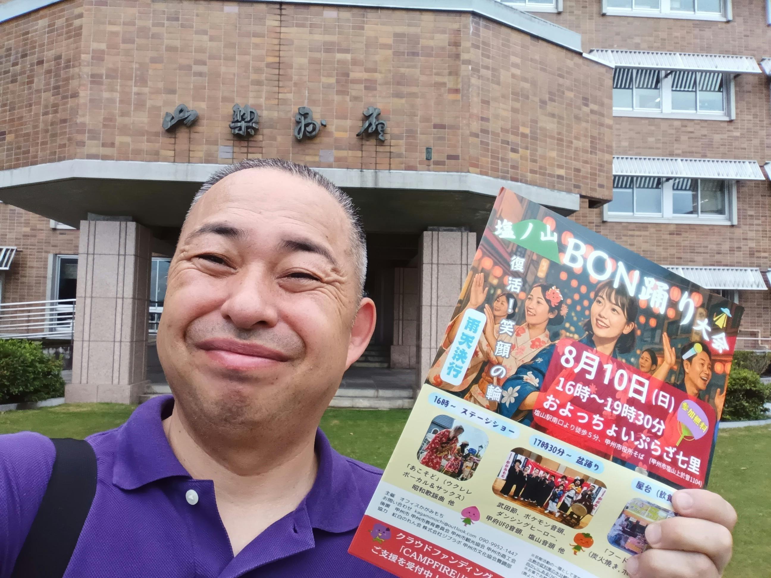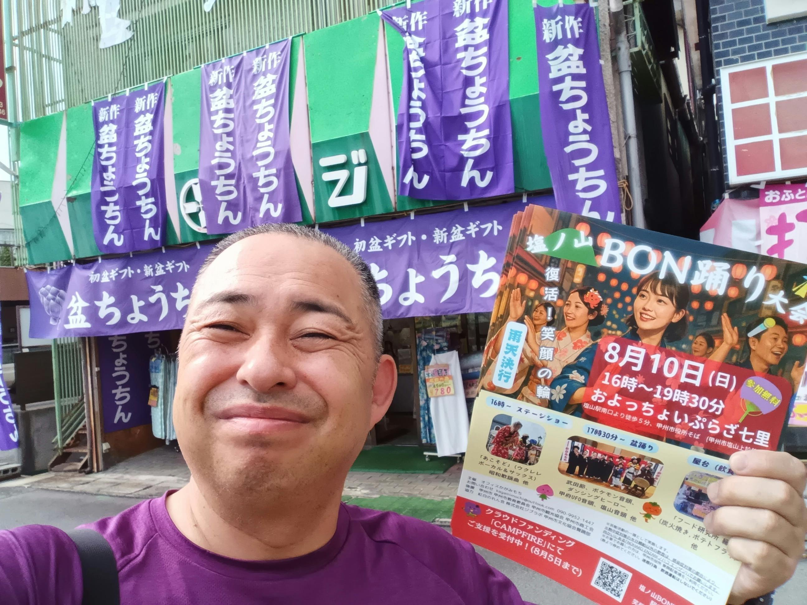 塩ノ山BON踊り大会 のチラシを塩山駅の周辺にある商店など、約20軒へ配布しました!みなさん、快く掲示して下さり、心より感謝いたします。「盆踊り、懐かしいね〜」「賑やかになり楽しそう!」など、激励くださいました。成功するように、準備して参ります。