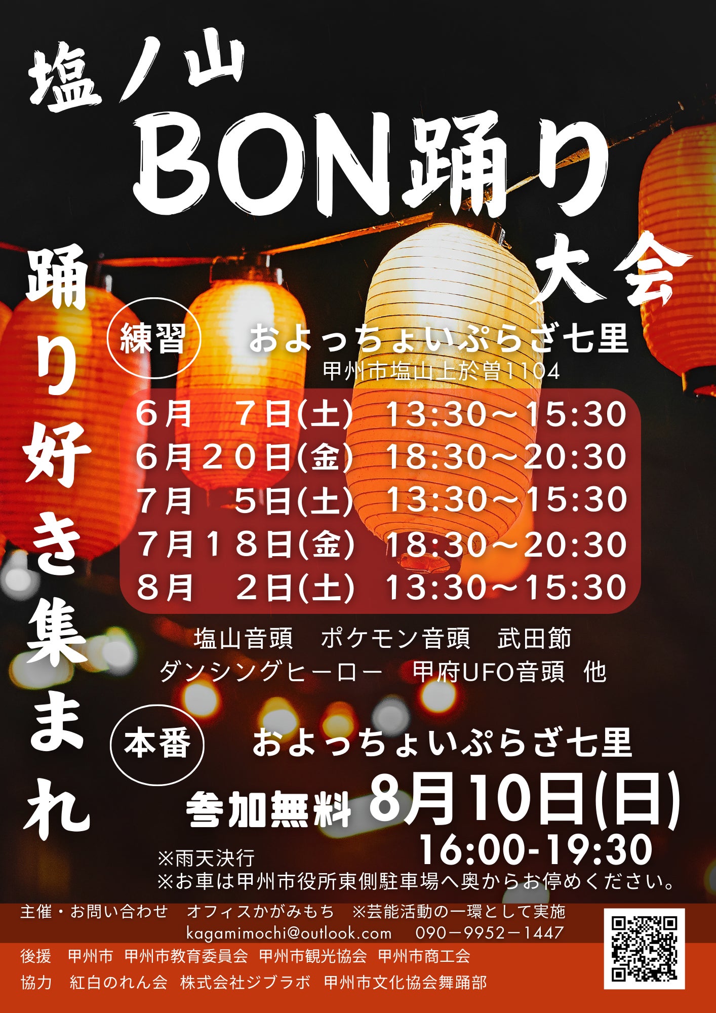 後援は、甲州市、甲州市教育委員会、甲州市観光協会、甲州市商工会、協力は、紅白のれん会、株式会社ジブラボ、甲州市文化協会舞踊部です。