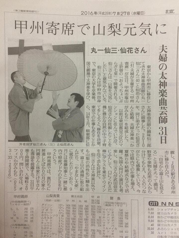 オフィスかがみもち所属の、甲州おもてなし芸人「かがみもち」は、江戸時代から続く伝統芸能の「太神楽(だいかぐら)」を、山梨県を拠点に全国や海外で披露している、丸一仙三(まるいち せんざ)、丸一仙花(まるいち せんか)の夫婦コンビです。傘の上で升を回したり、獅子舞などを披露することを生業としています。