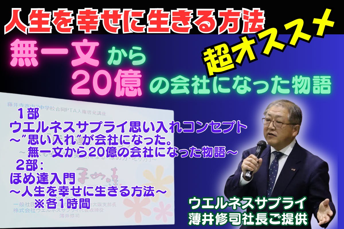 ②特別講演会「人生を幸せに生きる方法」 ~無一文から年商20億の会社を創った男のリアルストーリー~ もしあなたが、「人生をもっと充実させたい」「心から幸せを感じられる生き方がしたい」「逆境を乗り越える力を身につけたい」そう思っているなら、この講演は間違いなくあなたの人生にヒントをくれるでしょう。