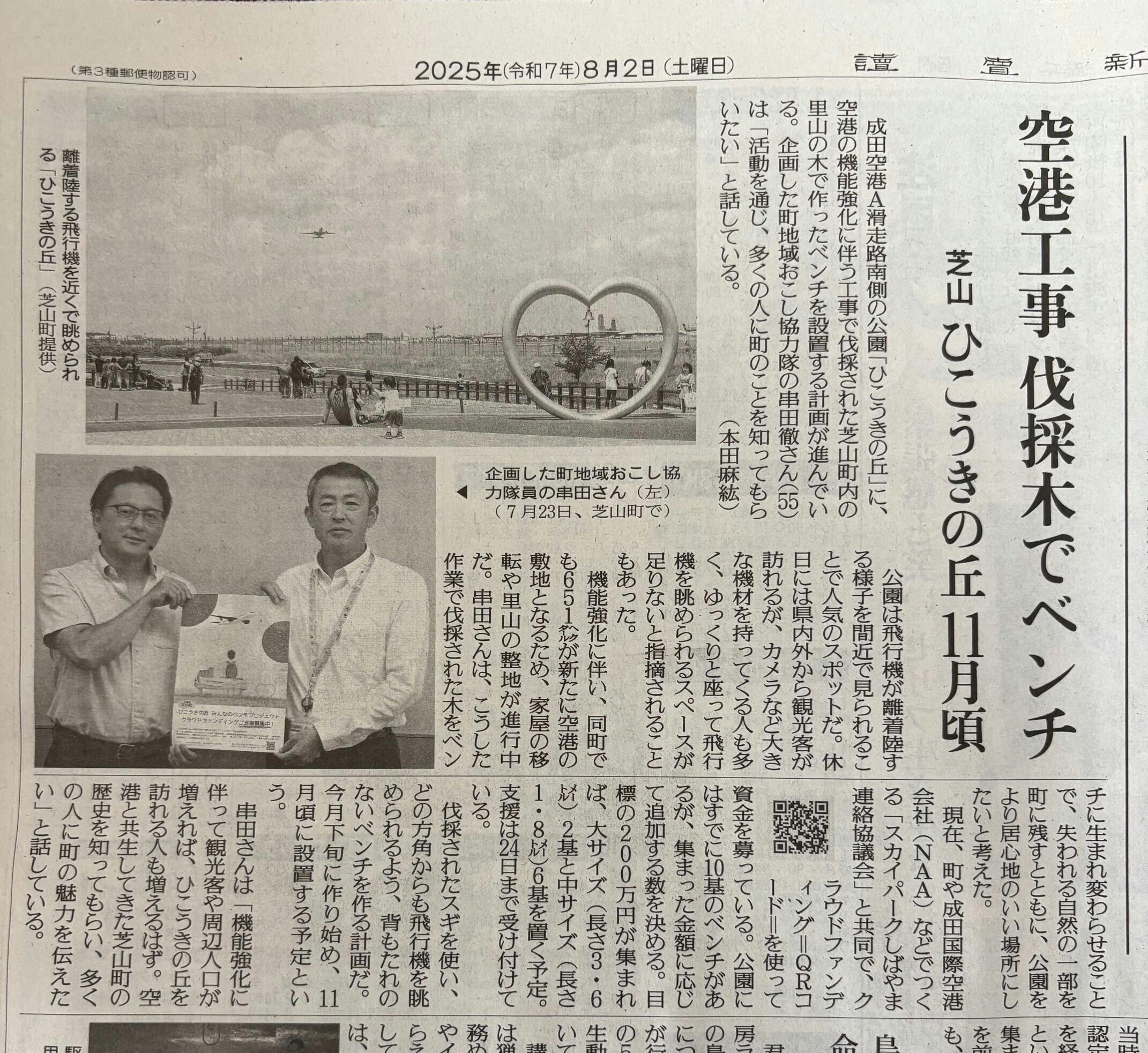 本日(8/2)読売新聞<千葉版>に先日芝山町役場で取材を受けた記事が掲載されました。何とか1台でも多くの里山ベンチを設置すべくこれからも積極的な発信を続けてゆきます。