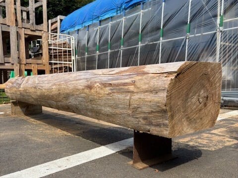 さて、ベンチの試作状況ですが、ベンチのボディ部分は丸太1本を丸々使うというところまでは決まっていたのですが、足の部分をどうするかは検討中でした。屋外に設置するという事を考慮すると、足部分は木材ではなく金属でコンクリートの平板に設置する工法がベストであるという事になり、最終的には写真のような形状で進めることにしました。