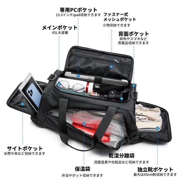 多様なポケットが搭載しているので、スマホ、ノートパソコン、服、靴などの日常必需品を収納可能です!物の取り出しがとても便利です!