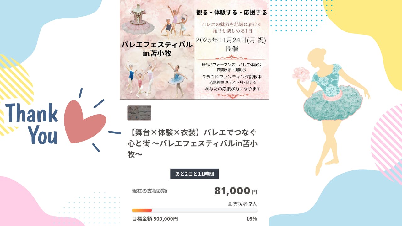 2025/07/05 14:54ご支援頂きました方 ありがとうございます。残す所あと2日となりました。応援して頂けることとても励みになり嬉しいです。クラファンを始めて教室Instagramのフォローが増えました。活動に興味を持って頂いて見守って頂いているようでとても嬉しいです。イベントInstagram、LINEアカウントもあります。クラファン終了してもイベント終了までレッスン風景等の情報発信を行っていきますのでフォローよろしくお願いします。バレエフェスティバルin苫小牧ユーザーネーム: @balletfestivalintomakomaiイベントLINEアカウント もっと見る