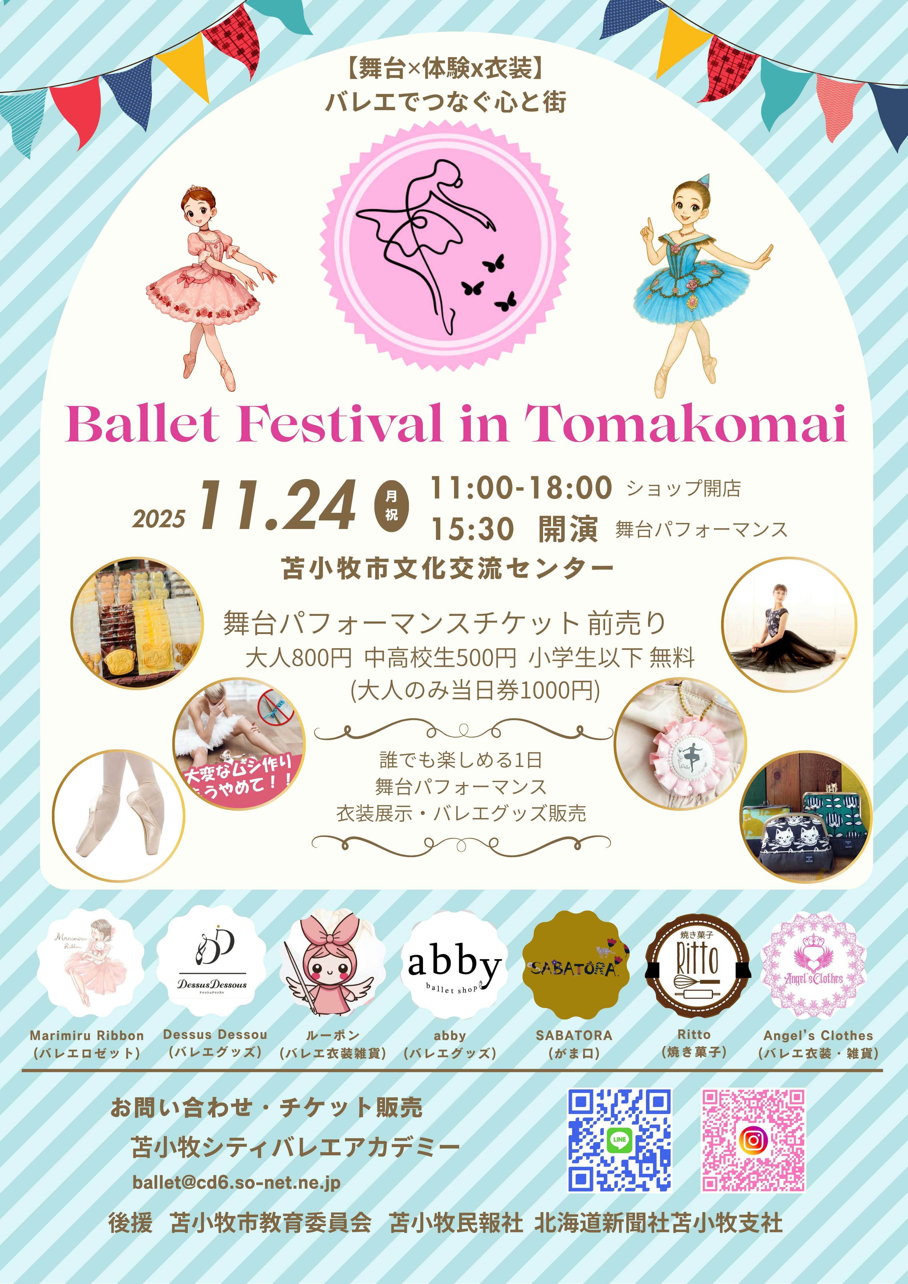2025/11/11 21:54バレエフェスティバル in 苫小牧 開催まで、いよいよ2週間を切りました。イベント準備もいよいよ佳境を迎え、出演者たちは最終的な踊り込みに励んでおります。皆様に楽しんでいただける舞台となるよう、最後まで一生懸命練習を重ねています。今回の出演団体は以下の通りです。ティアトルバレッタクラシックバレエ(苫小牧)スタジオドリームアート(苫小牧)苫小牧シティバレエアカデミー(苫小牧)大人バレエアカデミー(東京)また、ステージパフォーマンスの中では、事前募集により集まった子どもたちがバレエのステップを体験するコーナーもございます。お客様にもご参加いただき、会場全体で一緒に楽しめる舞台を目指しています。ギャラリースペースでは、バレエ衣装の展示も行います。どの衣装を展示するか、どのように見やすく楽しんでいただけるかを検討しながら、現在も打ち合わせを重ねています。同スペース内では、バレエショップや雑貨店による物販も開催されます。出店ショップ一覧Abby(バレエショップ・東京)Dessus Dessou(バレエショップ・東京)ルーポン(バレエ衣装付属品・東京)Marimiru Ribbon(バレエロゼッタ・札幌)RITTO(焼き菓子・千歳)SABATOR(がま口・苫小牧)Angel’s Clothes(バレエ雑貨・苫小牧)Angel’s Clothes Costume(バレエ衣装・苫小牧)さらに、ギャラリー内では子どもたちが楽しめる制作体験型のワークショップも開催します。バレリーナ柄のバッグにビジューをつけて、オリジナルバッグを作るなど、小さなお子様も楽しめる内容です。今回、日頃より応援いただいている支援者様をステージパフォーマンス観覧にご招待いたします。お近くの支援者様は、ぜひお時間の許す限りお越しください。お越しいただける場合は事前にお知らせください。お席をご用意させていただきます。 もっと見る