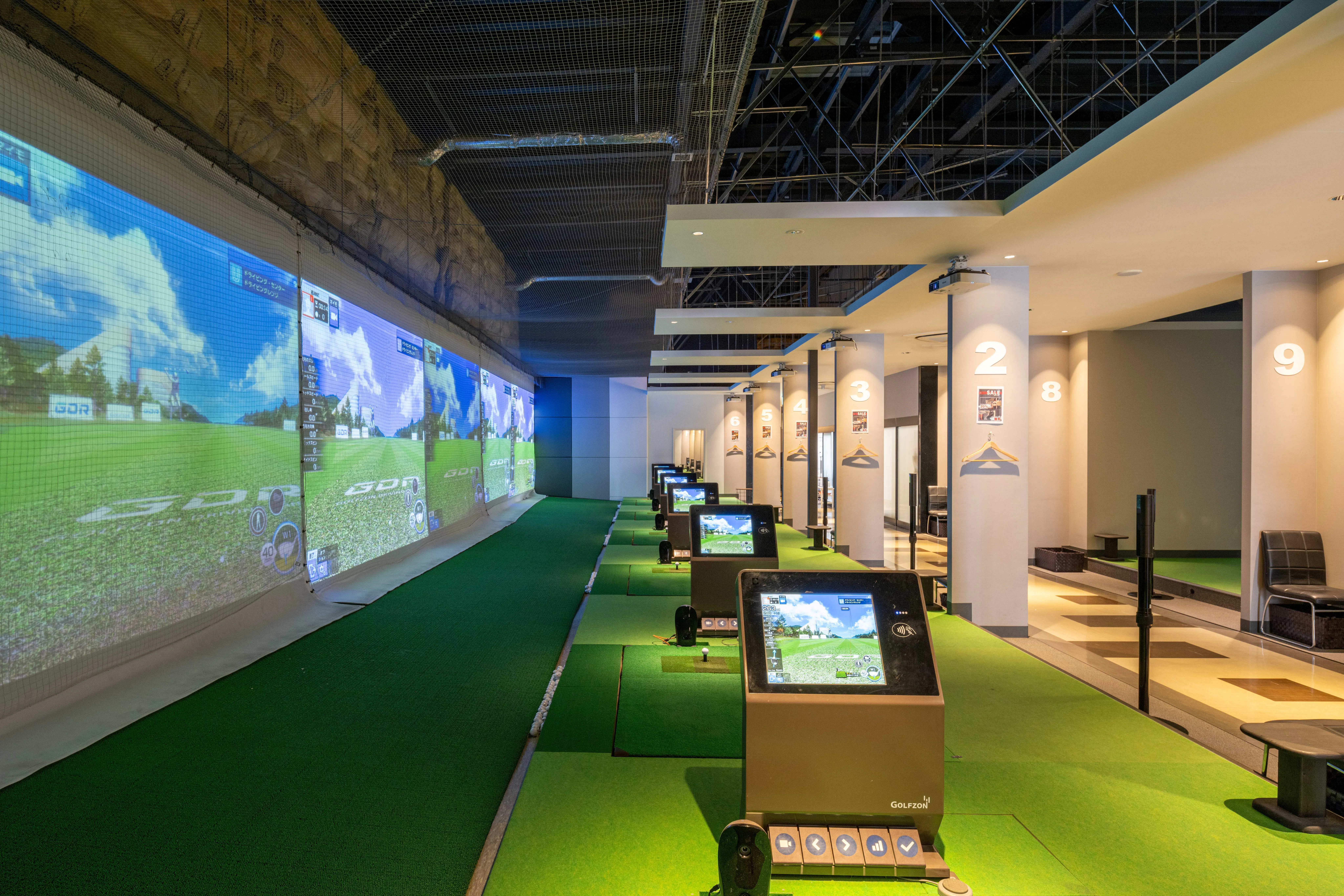最新の「GOLFZON」シミュレーターを通常打席9台・VIP打席2台設置し、リアルなゴルフ体験が可能です。