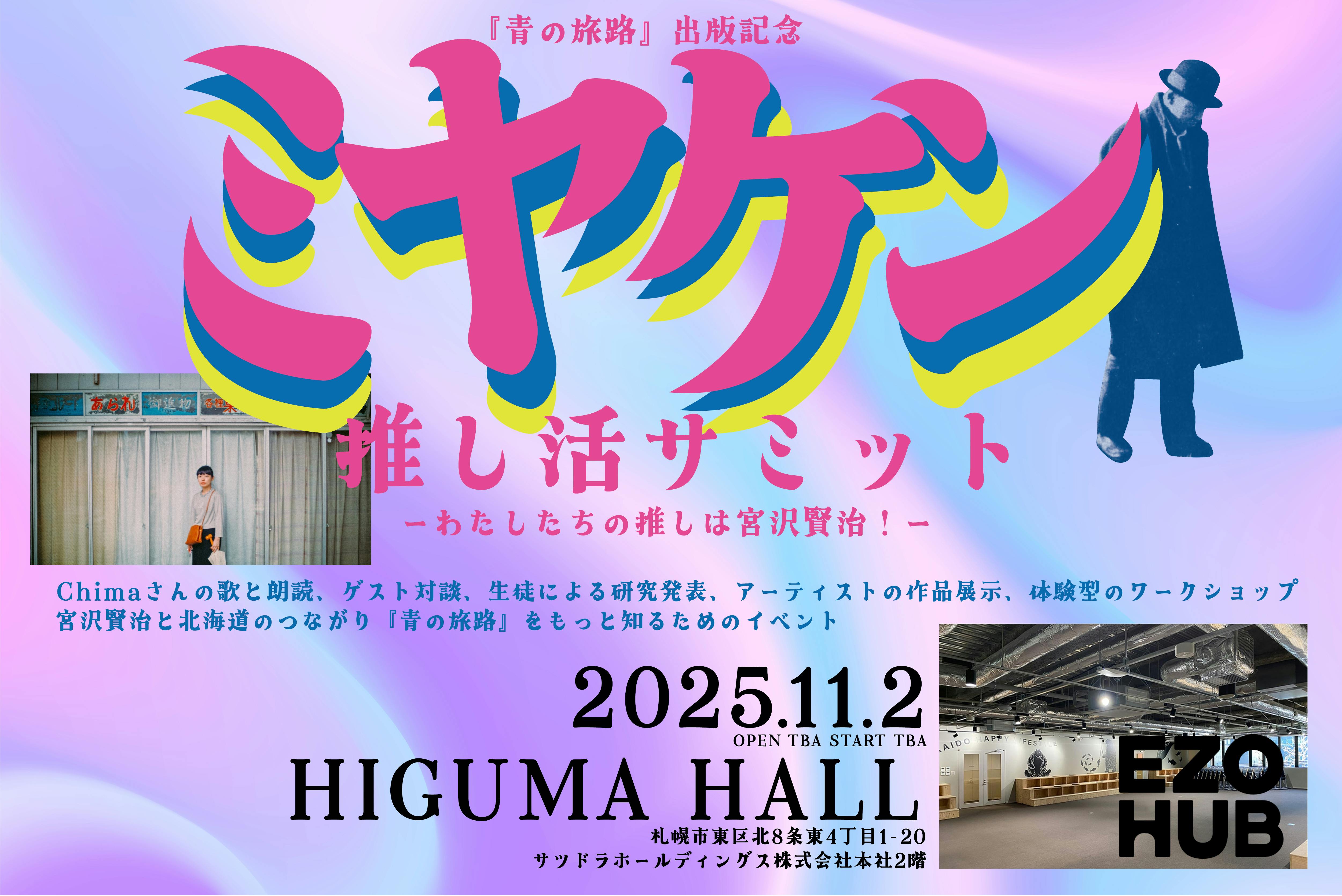 『青の旅路』を読んで、「えっ!宮沢賢治って私たちの町に来てたの?」「宮沢賢治ってなんかいいかも」「ちょっと、この気持ちを誰かと共有したいかも」と思ってくれた高校生たちの熱を冷まさないために、私たちはみんなが集えるサミットを計画しています。2025年11月2日(日)、場所は、EZO HUBのHIGUMA HALLです。