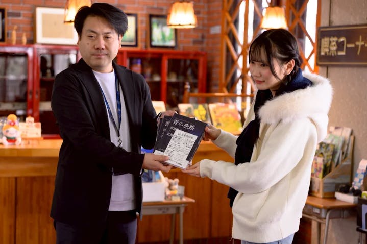 宮沢賢治記念館では、リメイクした『青の旅路』を宮沢賢治さんの弟の孫である、宮澤明裕さんに直接受け取ってもらうことができました。そしてイーハトーブセンターでは『青の旅路』を来場者の方にも見ていただけるような形で、置いていただいております!