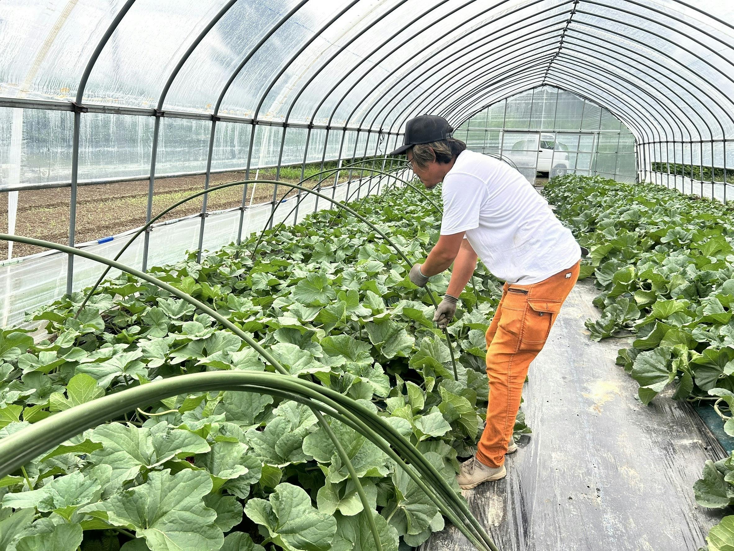ハウスが仕上げの時期に入ったため、現在は露地栽培のメロンの剪定作業を頑張っています!