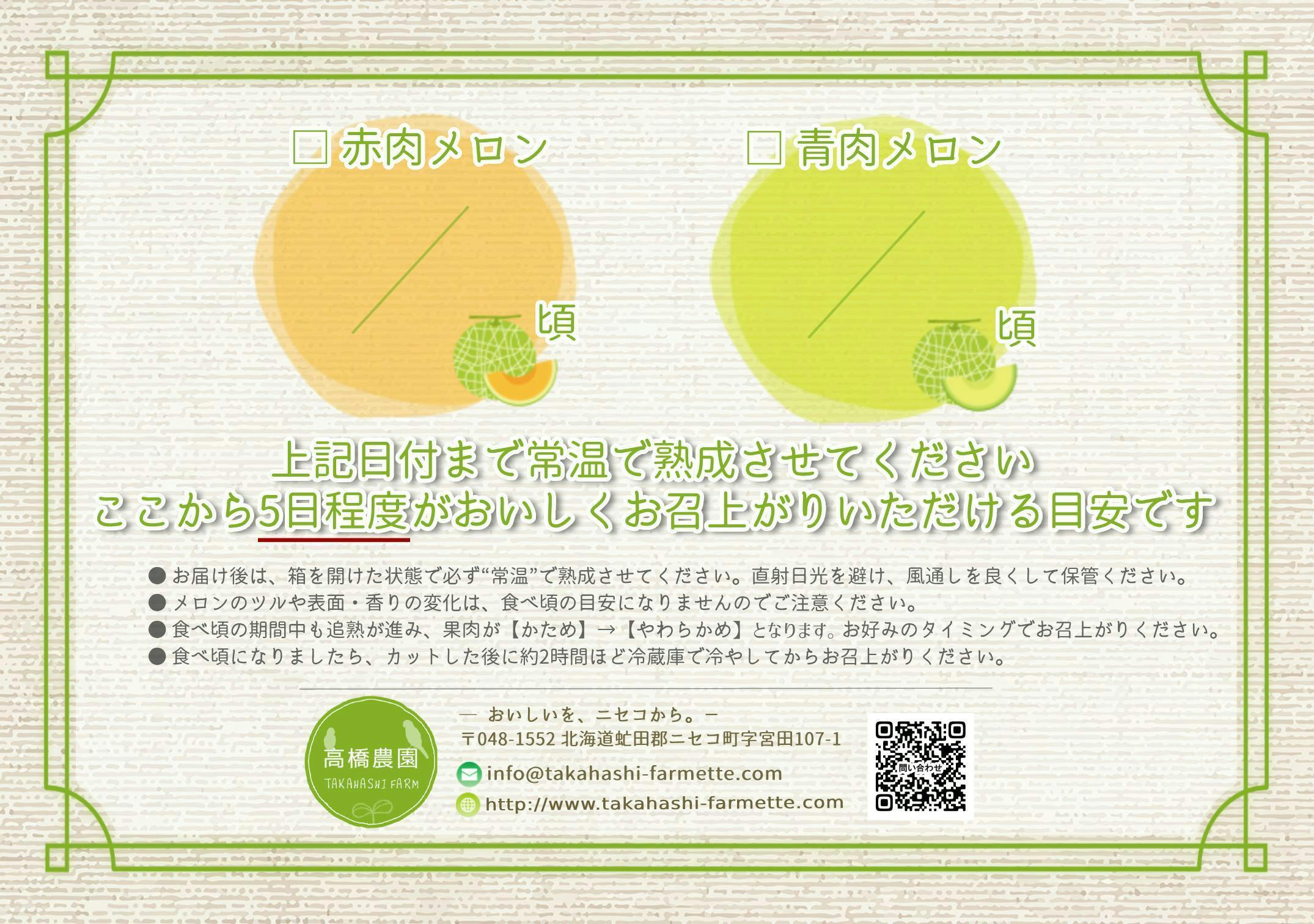 また、発送するメロンには、食べ頃時期や保存方法が分かりやすいように、こちらの紙を箱に入れて発送しております。食べ頃の時期や追熟の仕方など、こちらを参考にしてみてください!
