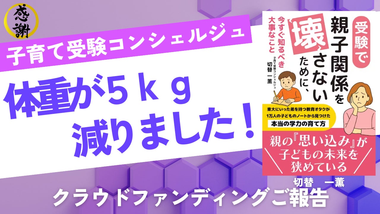 こんにちは、子育て、受験コンシェルジュの切替です。オンラインで学習、受験、子育てや教育などの困りごとの相談を受けています。体重が、5kg減りました!最初は食べなきゃと思っていたのですが、食べても気持ち悪くなったり、お腹が痛くなったりしてトイレにこもるだけなので、あまり食べなくなってしまいました…クラウドファンディング開始前の体重が65kg弱だったのですが、今朝は59.3kgに…ダイエットしたい方にオススメですな(笑)心からの感謝を込めておかげ様で、約100万円のご支援を頂くことができました。本当に、本当にありがとうございます。皆様からの温かいご支援とメッセージに、毎日励まされています。一つひとつのご支援が、どれだけ私の背中を押してくださっているか、言葉では言い尽くせません。紙書籍として、より多くの悩めるご家庭にこの本を届けるため、残り170万円の支援を目指して、あと2週間、全力で走り抜けます。今、私がやっていることクラウドファンディング成功に向けて、日々様々な活動に取り組んでいます。正直に言うと、うまくいかないことも多くて…でも、その過程も含めて、皆様に共有させてください。● 企業・メディアへの売り込みプレスリリースを作成し、50箇所以上の媒体に一件ずつ丁寧にメッセージを添えて送らせていただきました。スパムのような送り方はしたくないので、送り先を一つひとつ選びながら、その媒体に合わせた文章を作成しています。例によって「書いては消し、書いては消し」を繰り返しているので、本当に時間がかかります。本音を言うと…一件も反応がなくて、正直しょげています。「そういうものだ」と聞いてはいたけれど、全くあたりがないのは結構グサッときますね。でも、100件まではやるだけやってみようと思っています!●リアルな出会いを大切にコンサルの方から「とにかく人と会って、一人でも多くの人と話してくること」とアドバイスを頂き、週2〜3回のペースでセミナーや会合に参加させていただいています(zoom含む)。ここ5年間で1回くらいしか参加していなかった私にとっては、超ハイペースです。それでも、ありがたいことに「セミナーやってよ」と声をかけていただき、2回ほどお話しさせていただく機会にも恵まれました。●新しい挑戦:専門家の皆様とのコミュニケーションそして今、新たに取り組んでいるのが、ソクラテスのたまごに登録されている専門家の皆様とのコミュニケーションです。今後、同じようにクラウドファンディングで書籍出版を目指す方のために、私の経験をお伝えできないかと考えました。「実際どうなの?」という生の声を共有する機会があれば、と。せっかくなので、対談形式で露出の機会としても活用できたらと思い、数百名全員のプロフィールを読ませていただきました。これがまためちゃくちゃ大変で…(笑)でも、私の知らないアプローチで子育てや教育の課題に向き合っている方が本当に多く、見ているだけでもすごく勉強になりました。お願いとご提案対談していただける専門家の方を募集しています!「子育てに正解なんてない」「色々な考え方、様々なやり方がある」ということを、視聴者の皆様に伝えられる対談ができたらと思っています。ソクラテスのたまごの方に限りませんので、もしご興味のある方がいらっしゃいましたら、ぜひお声がけください!企業・団体様のロゴ掲載リターンもお待ちしております!お名前やロゴを載せるリターンもご用意しております。書籍に掲載されることで、広告としてもご活用いただけます。ご支援と同時に、貴社・貴団体のPRにもなる機会です。残り2週間、走り抜けます反応がなくて凹むこともあります。時間がかかって疲れることもあります。でも、皆様からのご支援があるから、前を向いて進めています。親子関係で悩み、子どもの勉強で苦しんでいるご家庭に、この本を届けたい。「楽しく受験を乗り切れた」と笑顔で言ってもらえる未来を作りたい。その想いを胸に、あと2週間、全力で頑張ります。引き続き、応援をどうぞよろしくお願いいたします!Youtube【関連動画】書籍紹介「受験で親子関係を壊さないために今すぐ知るべき大事なこと」学習法診断のリターン紹介(リターンの種類と診断の流れ)学習法診断のリターン紹介(ベーシック診断)学習法診断のリターン紹介(受験用診断)【最初で最後】こんなてんこ盛りサービスは二度とやりません:クラファン限定動画・診断付き!今だけのリターン紹介皆様の温かいご支援とシェアが、大きな力になります。心から感謝申し上げます。