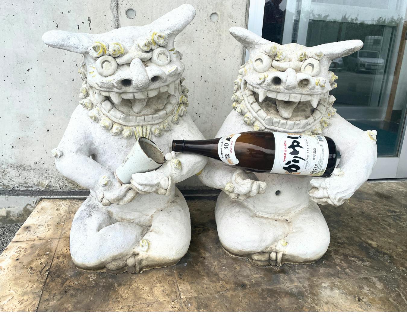 新里酒造様の商品「かりゆし」をもった笑顔のシーサー