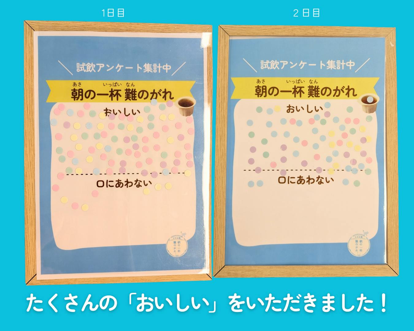 たくさんのお客様にもろみ酢のご試飲をいただき味の評価をシールでつけてアンケート集計をさせていただきました。その結果なんと92%のお客様に「おいしい」と回答をいただきました!