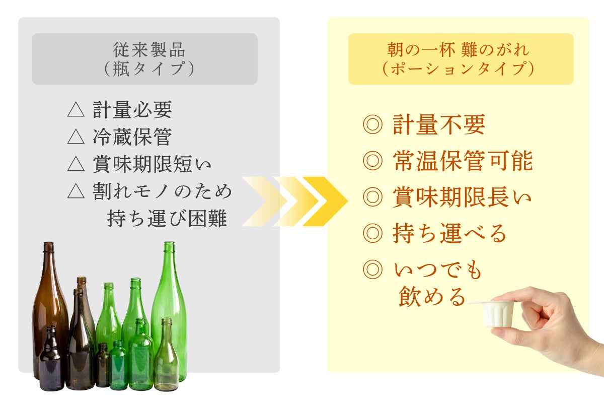 そこで「朝の一杯 難のがれ」は、現代のライフスタイルに合わせたアイデアをプラスした「新しいカタチ」を採用。1回飲みきりのポーションタイプにしました。