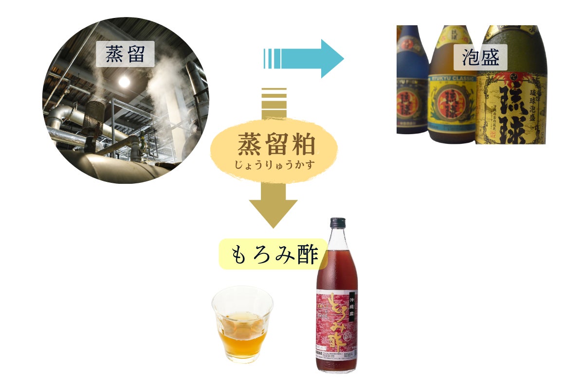 原料の全てを黒麹にして発酵させる、全麹仕込みという手法によりつくられ、発酵力が強く、高温多湿な気候にも適していたことから沖縄で泡盛づくりが盛んになりました。単式蒸留機で1回だけ蒸留を行いますが、その際に発生する絞り粕(蒸留粕)から得られるのが「もろみ酢」です。