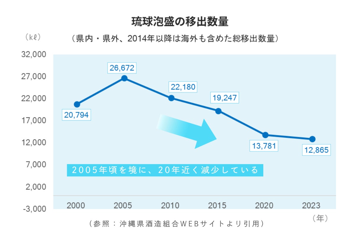 ピークだった2005年頃を境に、泡盛の生産量は20年近く減少し続け、経営の厳しさから後継者が見つからないという蔵元も増えてきました。