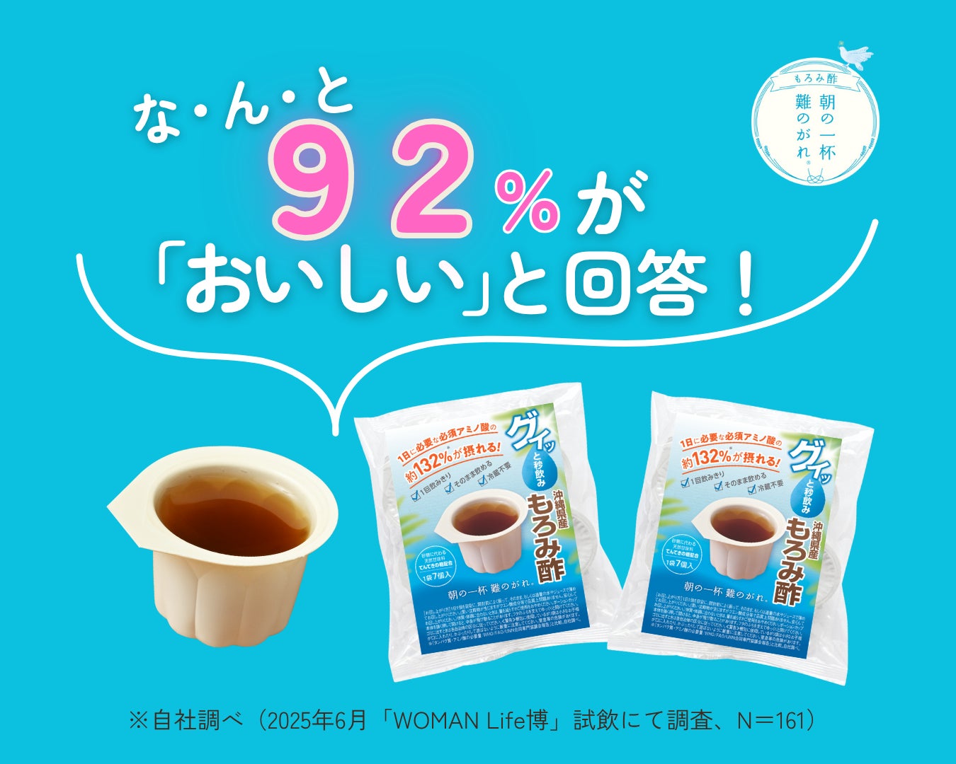 2025/06/09 14:232025年6月6日(金)・7日(土)の2日間、福岡市天神にて女性の悩みに寄り添うイベント「WOMAN Life博」に「沖縄県産もろみ酢 朝の一杯 難のがれ」で出展をしてきました。女性向けの美容や健康、妊活、更年期など女性の様々なライフスタイルを応援、サポートする商品が勢揃いしていました。たくさんのお客様にもろみ酢のご試飲をいただき味の評価をシールでつけてアンケート集計をさせていただきました。その結果なんと92%のお客様に「おいしい」と回答をいただきました!「お酢のなのに酸っぱくなくてビックリ」「とても美味しくてびっくり!」「黒酢より全然飲みやすい」「お酢の苦手感が克服できそう」「希釈しなくていいなら楽だね」「味も飲みやすくて回復効果を感じられたら継続できそう」「これからの梅雨の季節にもぴったりな健康食品」などなどたくさんのご感想をいただきました。これから梅雨で暑くジメジメして疲れがとれない、なんてこともグイッと一杯!!「朝の一杯 難のがれ」で毎日の元気をサポートしませんか。※こちらは「朝の一杯 難のがれ 乳酸菌 1億プラス+」(仮)ではございません。沖縄県産もろみ酢「朝の一杯 難のがれ」購入はこちらから もっと見る
