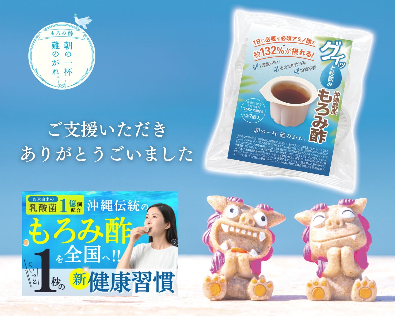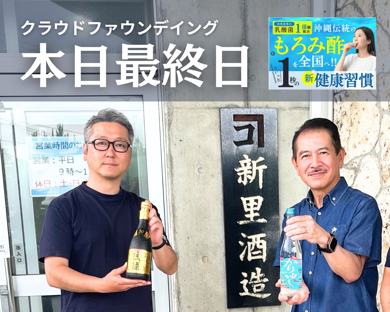 2025/06/25 10:48【ご支援者のみなさまへ】5月12日よりスタートした「【新しいカタチのもろみ酢】で沖縄の伝統を守りたい!乳酸菌1億個配合の新健康習慣」プロジェクトが本日最終日となっております。泡盛の副産物であり、豊富な栄養成分を含む「もろみ酢」に乳酸菌を配合した「新しいカタチの健康飲料」を開発することで、衰退する泡盛業界を盛り上げ未来へつなぐとともに、多くの方に健康と笑顔を届けたいと願い、立ち上げました。みなさまのあたたかいご支援をお待ちしております。ご支援は本日、6月25日(水) 23:59迄です。 もっと見る