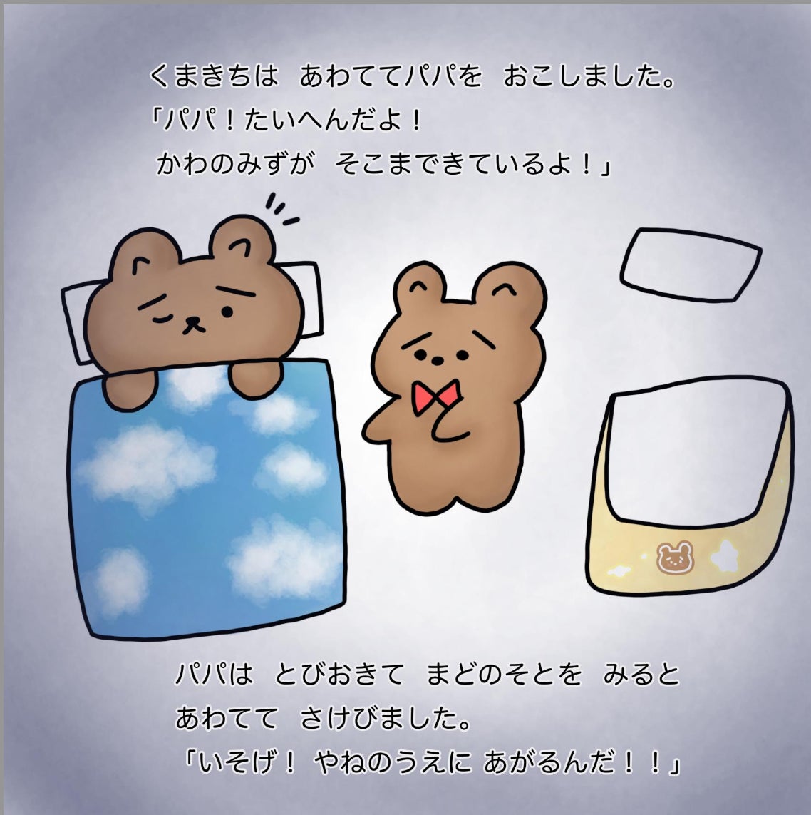 そこで、実体験に基づき、映像では伝えづらい災害の怖さを、子どもたちにもわかる形でやさしく伝える絵本を作成しました。