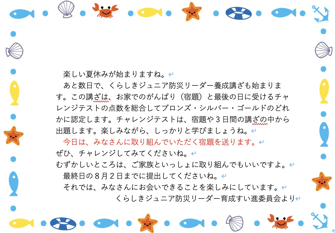 先日は、くらしきジュニア防災リーダー養成講座の受講生に、宿題を送付しました。