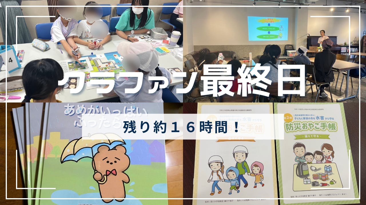 2025/07/13 08:21おはようございます!初の朝投稿です。昨日は、倉敷市真備町で開催された「真備船穂総踊り」に参加してきました。このお祭りには、災害後に真備町に支援に入っていたみなさんも、踊り連に参加したり、他の地区の方とも会えたりと、再会できる場として楽しみにしています。今年も、大変暑い中でしたが、「クラファン おめでとう!」「テレビ見たよ!」と声をかけてくださいました。災害はとても辛いものでしたが、人とのつながりが増えたり、深まったりできたことは、私たちの財産です。そして、昨日はもうひとつ。川辺地区にお住まいのかたから、クラファンに協力したいと連絡がありました。そのかたは、垂直避難を余儀なくされて救助を待っていたそうです。不思議と怖さはなく、救助の人に「知り合いが奥に取り残されているので、そちらに行かせてください」と言われても「はいはーい!私たちは大丈夫だから〜」と、待っていたそうです。ちなみに、ハザードマップは知っていても、見てはいなかったそうで、想定が5メートル以上の浸水だったと知っていれば、怖かったかもしれないと話をしました。(実際は4メートル程度でした)いろんな思いを抱えながら、たくさんの人の思いを私たちは預かりながら、これからも活動を続けていきたいと思います。さて、みなさんにお付き合いいただいたクラウドファンディングも、最終日となりました。目標達成後にもたくさんのご支援をいただき、10000円の絵本のリターンについては、2度目の【在庫なし】となりました。この活動が今年だけのものにならないよう、引き続き、最後までご支援ご協力をいただけたら幸いです。 もっと見る