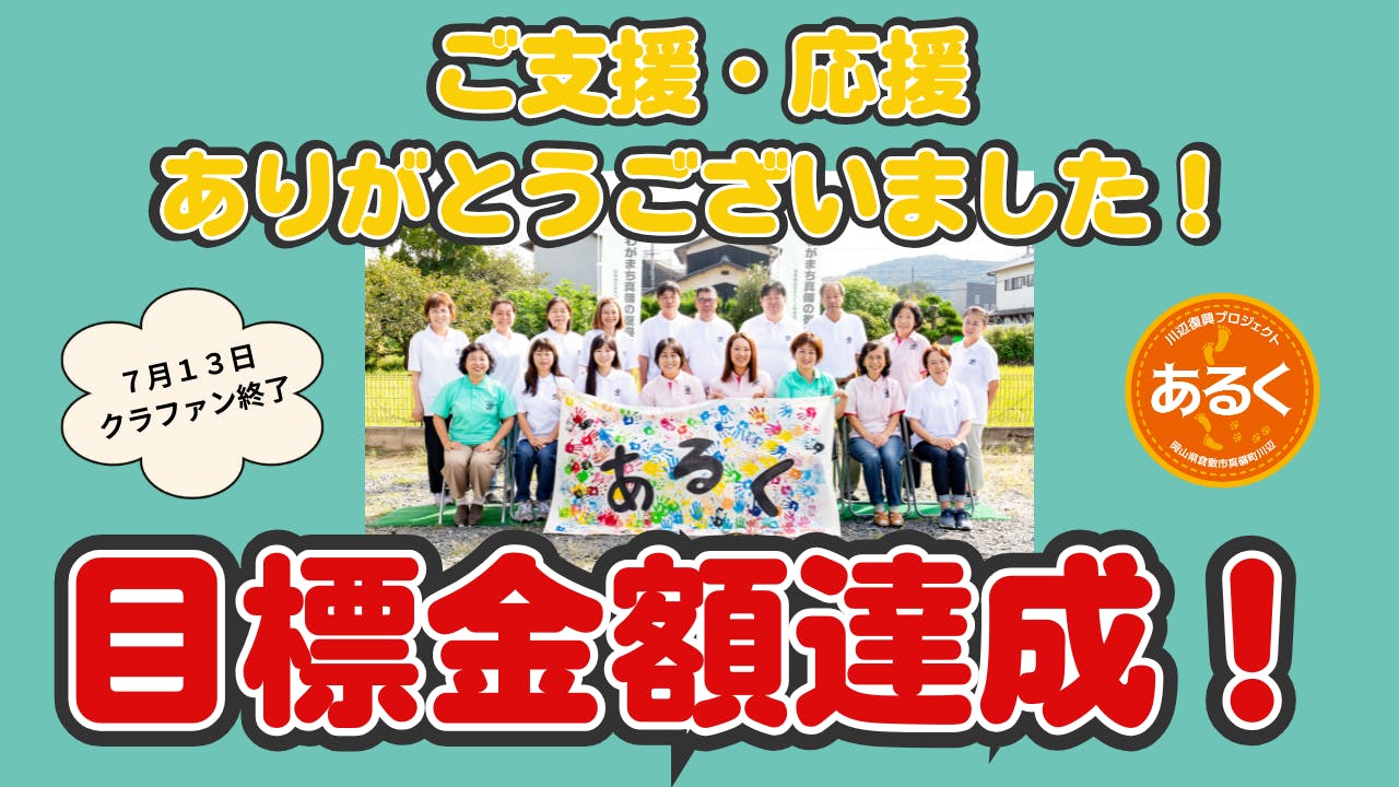 2025/07/14 21:55クラファン終了2日前に目標金額達成し、多くの方にお祝いのお言葉をいただき、喜びを噛み締めているところです。クラウドファンディングをすると決心したのは2月でした。香川大学の磯打千雅子先生にご相談させていただき、あるくスタッフで準備を進めてきました。そこから、昨日まで多くの方に背中を押していただき、見事ゴールすることができました!目標金額は200万!子どもたちの防災教育を継続していくこと、広めていくことを考え、最低でもこれぐらいは必要だと思い金額を設定しました。しかし、私たちの取り組みに対してみなさんがどのように感じていらっしゃるのか、社会から必要とされている活動になっているのか、時に不安になり、目標金額が手の届かない目標に見えることも多々ありました。それでも、ご支援者・ご協力者のみなさんが温かい(熱い)コメントと共に、シェアしてくださったことで、目標金額を達成し、さらに105%達成(+105,000円)でフィニッシュとなりました。そして、なんと168名の方にご支援をいただきました。スタッフ一同 感謝しています。しかし、私たちにとってはここがゴールではありません。「こんなにもたくさんの大人がみんなの命と未来を守りたいと思ってくれているよ」とみなさんの温かい思いをしっかりと子どもたちに伝えていきたいと思っています。ご支援・ご協力いただいた皆様に、すぐにでもお礼をお伝えしたいところですが、おひとりおひとりにお礼の言葉と返礼品をお届けしたいと思いますので、今しばらくお時間をください。本当に、ありがとうございました。 もっと見る