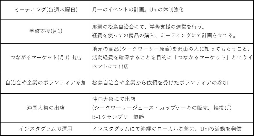 私たちは、沖縄国際大学のサークル「Uni」として2020年から活動を開始しました。沖縄の地域社会に対する深い愛情と関心を持ち、熱意をもって地域貢献活動に取り組んでいます。これまで、松島自治会での学修支援や自治会ボランティア活動、そしてInstagramを通じた地域の魅力発信を行ってきました。「Uni」は地域の皆様のためだけでなく、メンバー自身も成長できるサークルとして今後も成長し続けていきたいと日々努力しています。