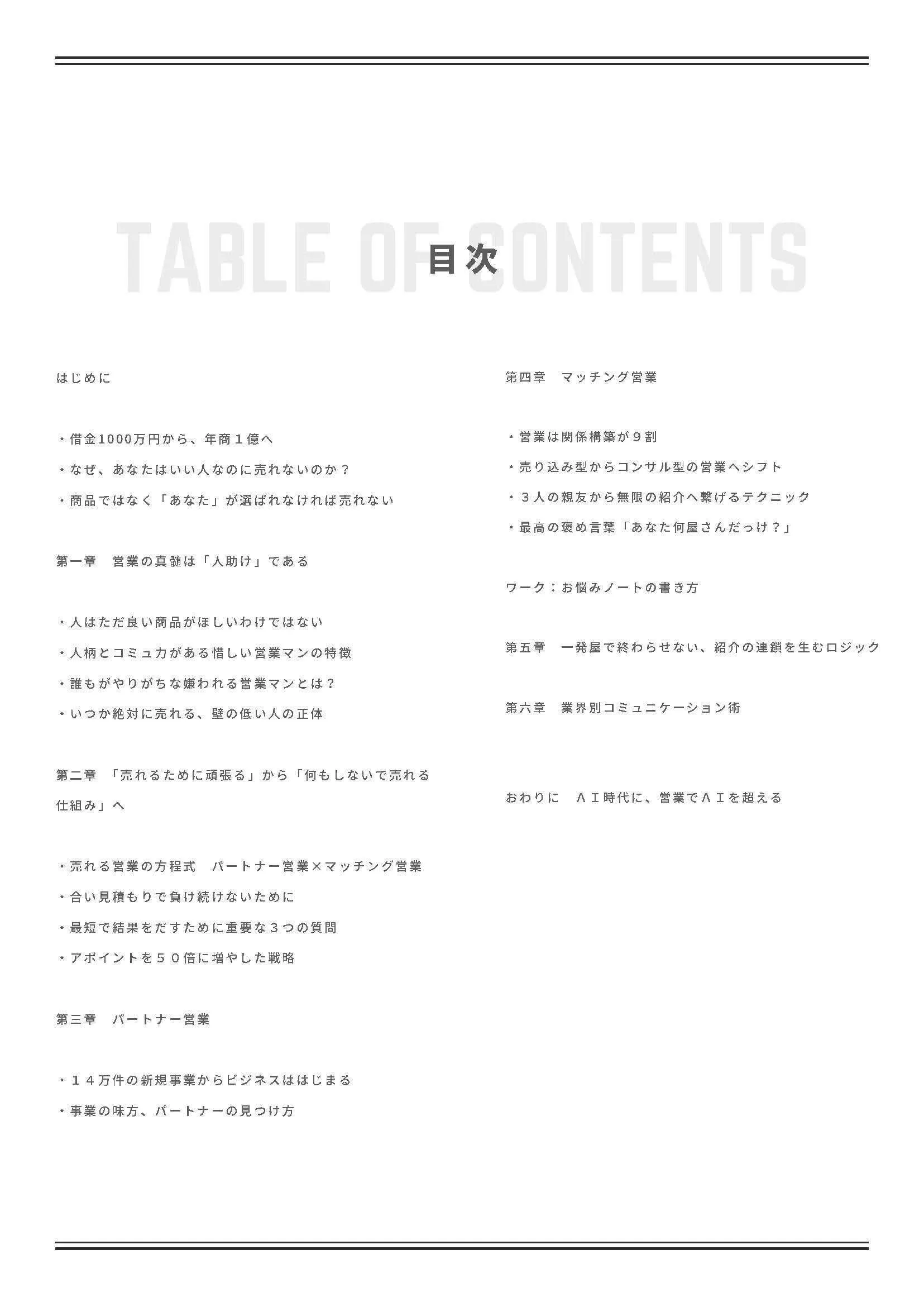 ついに、全体像が見える「目次」が完成しました! この本では、“売り込まない営業”がなぜ成果につながるのか、その具体的な方法を余すところなく紹介していきます。