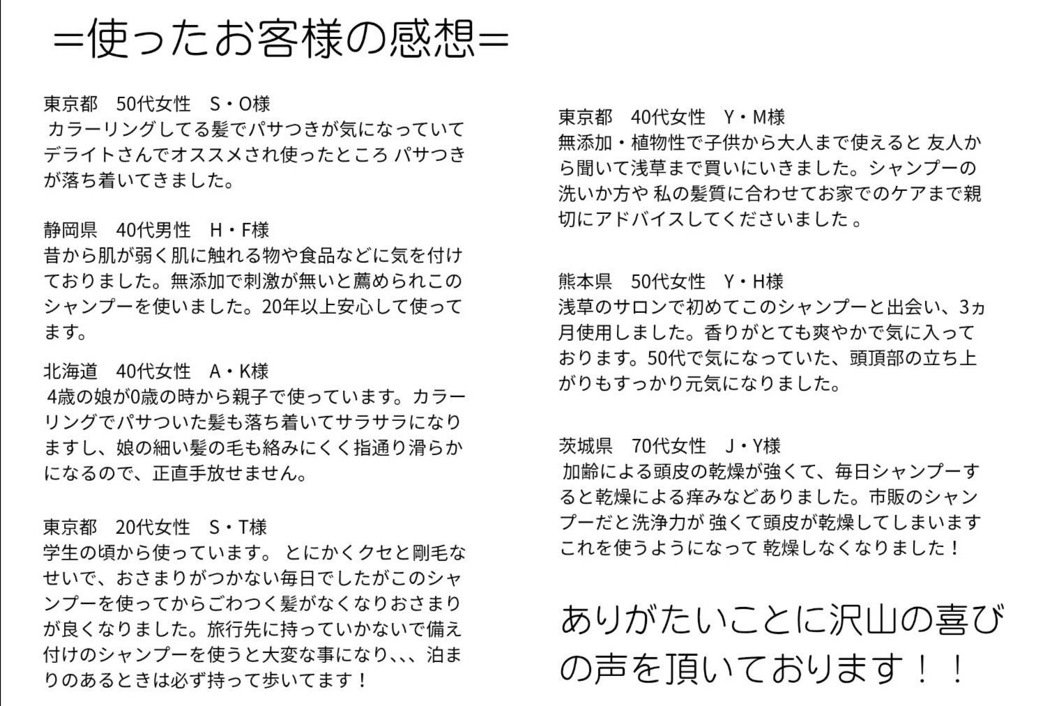 何より、今まで使ったことが無い方や当シャンプーの性質をご理解していただく事でリターンとします。