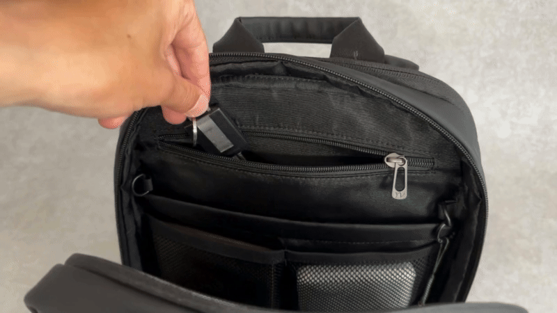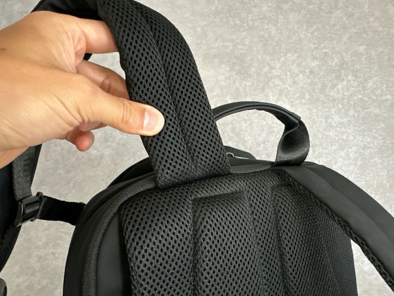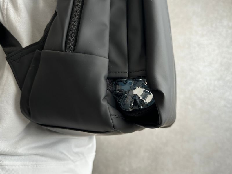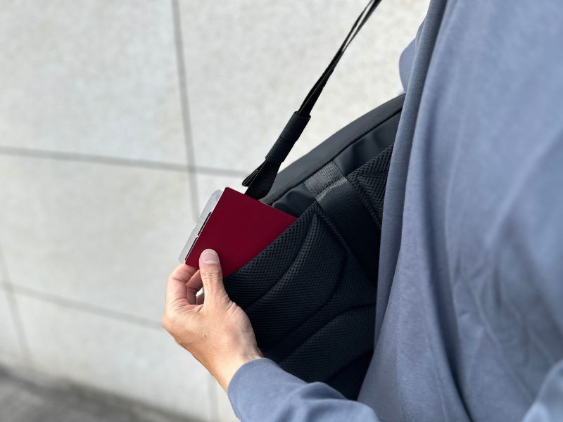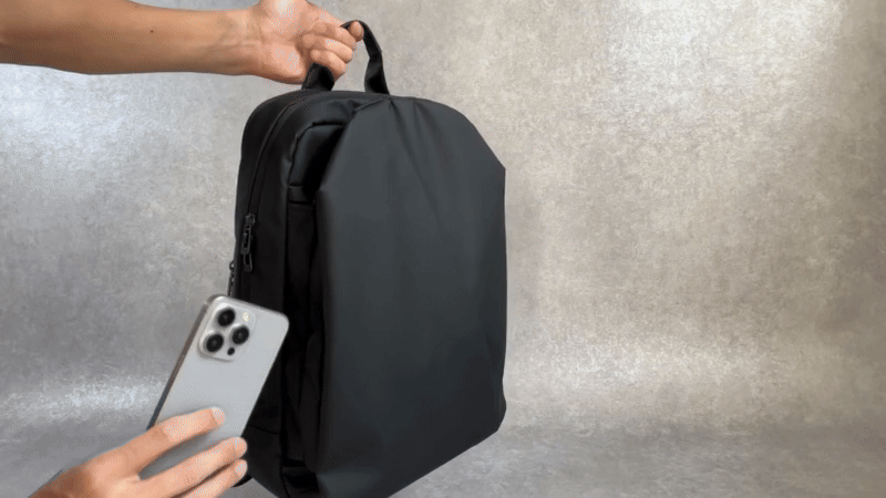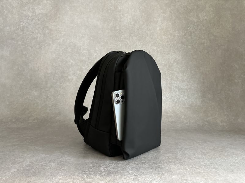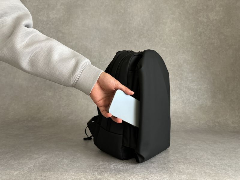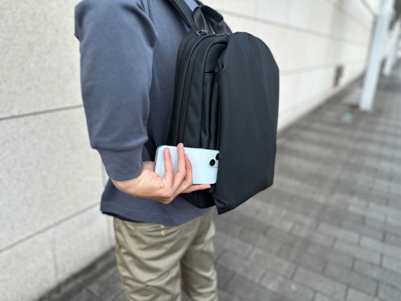 いちいちリュックを降ろす必要なく、肩にかけたままスマホを出し入れできます。