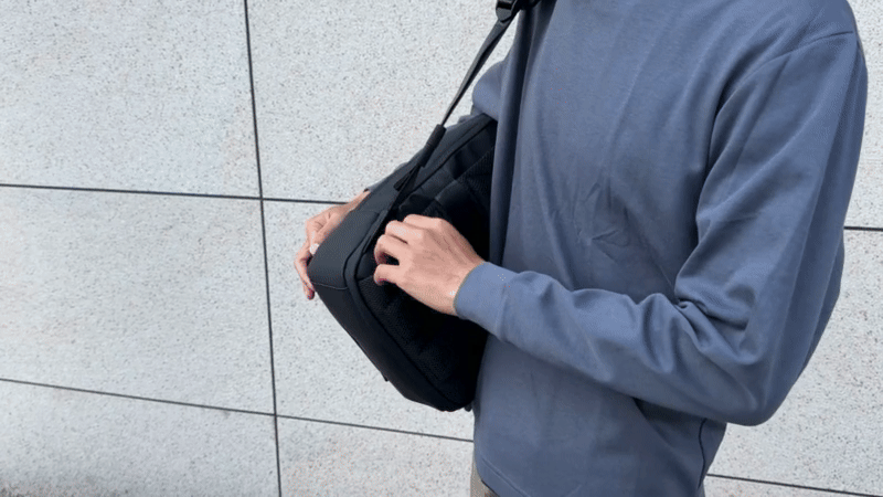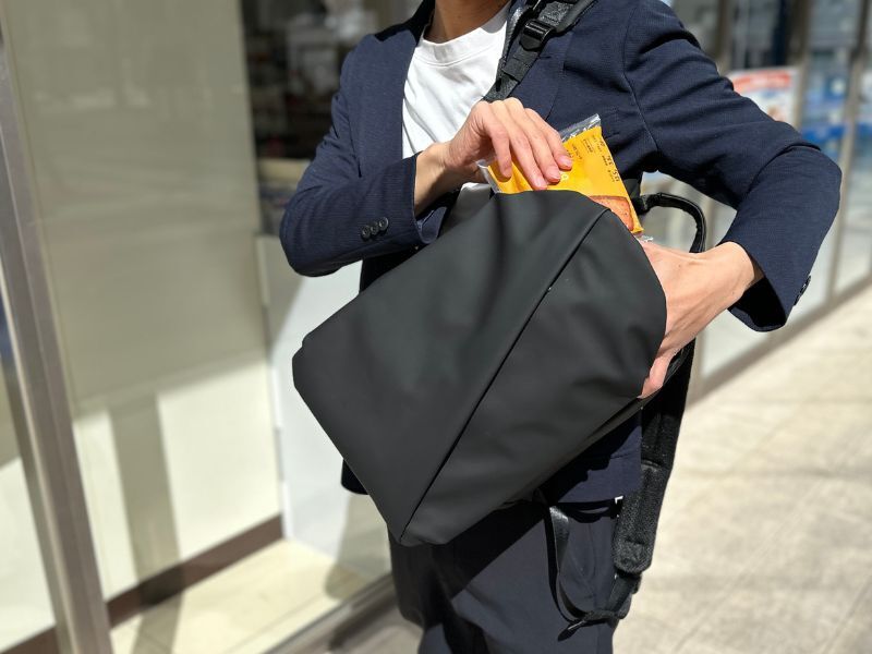 コンビニで買った荷物も、肩にかけたまま片手でサッとポケットに。