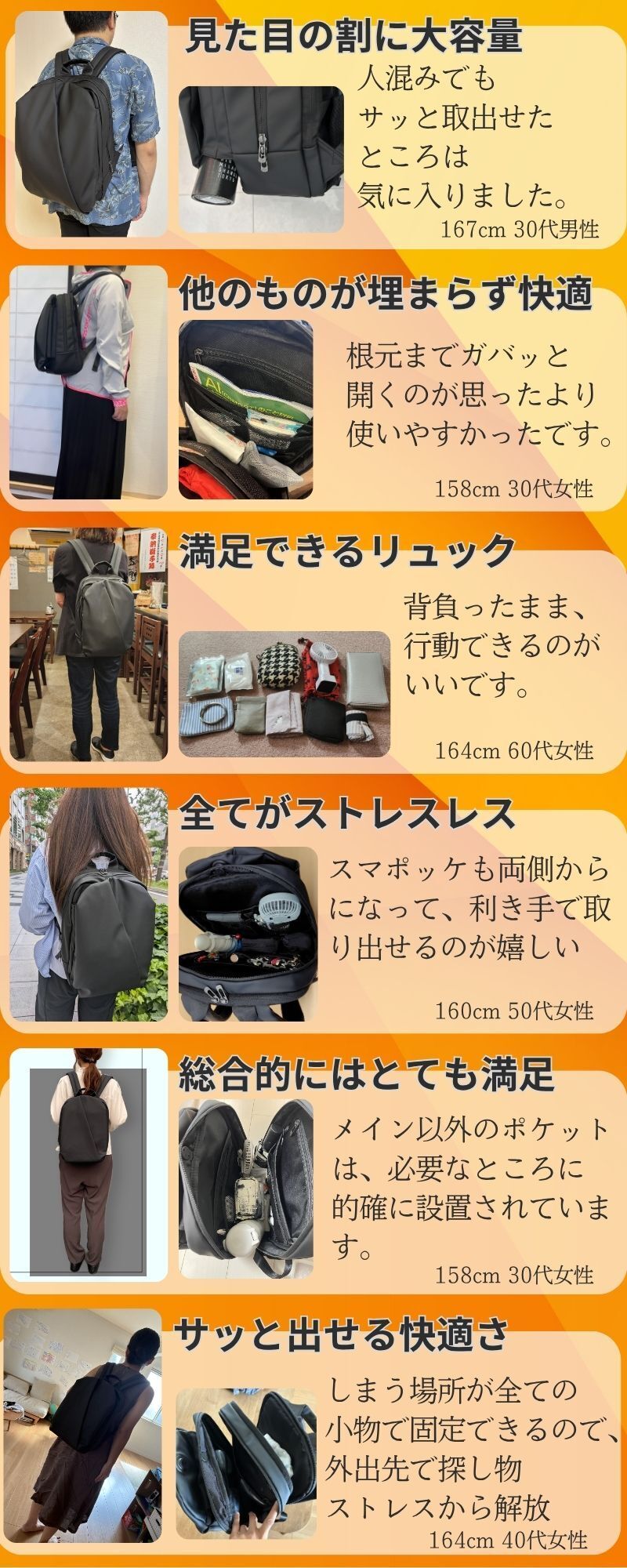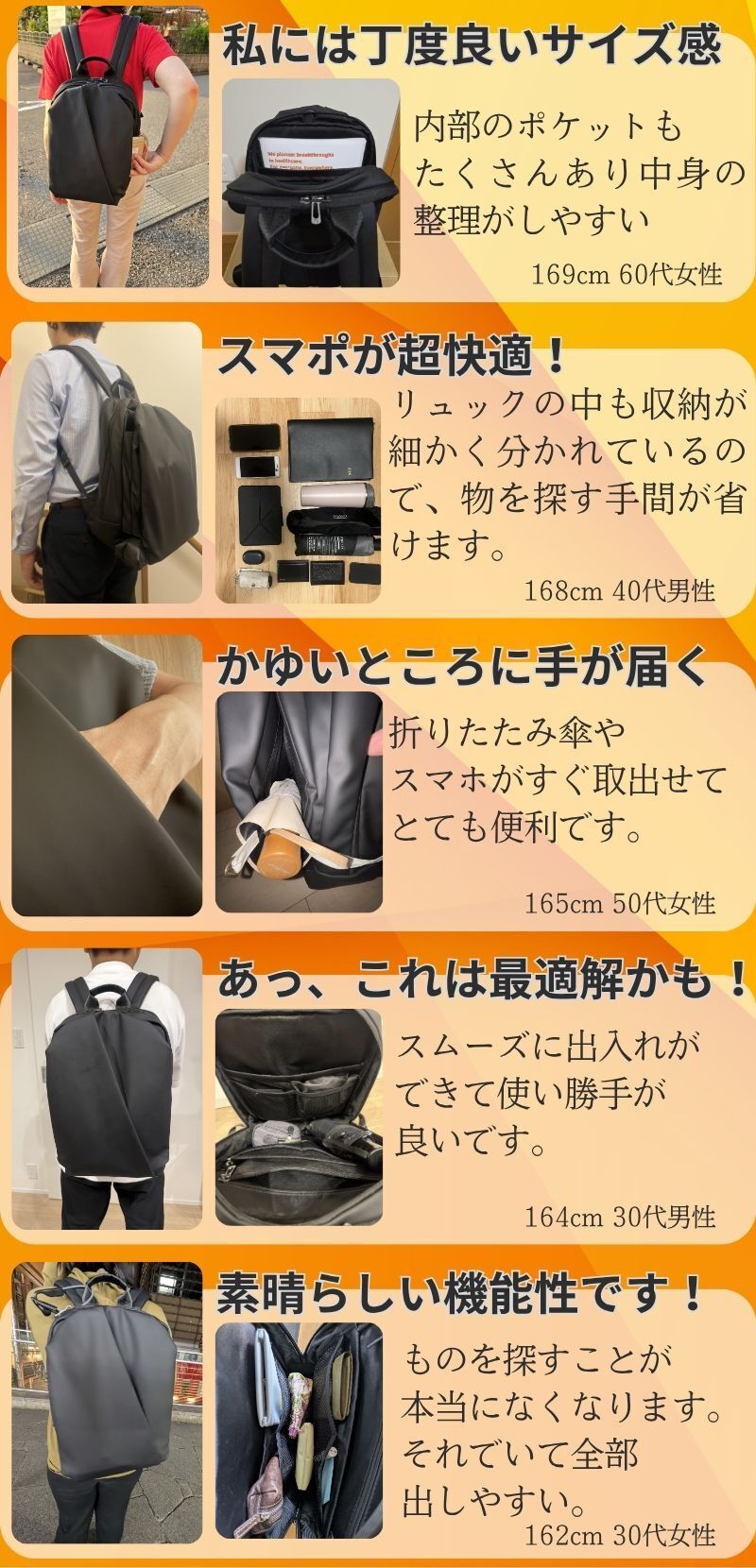 A.通勤、出張で移動が多い、パソコンをよく持ち歩く、スマホの出し入れが手間で嫌、荷物が取り出しにくいことにストレスを感じる、バッグをいちいち降ろさず荷物の出し入れがしたい、そんな方におすすめです。