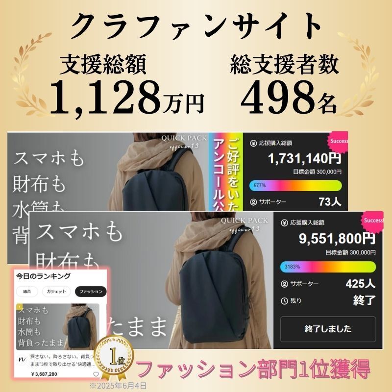 2026/03/27 12:30支援者のみなさまいつもプロジェクトの応援ありがとうございます。本日12時よりあなたのワークライフを快適にするボディバッグ「2サイズ同時の限定販売」が公開されました。【タブレット対応】QUICK PACK 11sは「大容量なコンパクトモデル」。普段タブレットや電子書籍とマイボトル程度で通勤される方に最適のサイズ。男性女性問わず“体にフィット”するサイズ感で、1,000名近い方にご愛用頂いています。一方、【A4/PC対応】QUICK PACK 15sはリュックは大きい、ショルダーでは小さい...そんなニーズに応える15インチサイズのワーカーズバッグ。ノートPCとA4の書類、充電器にマウスなど、ガジェットをまるっと持ち歩くことが多い方にピッタリ。どちらも斜め掛けでサッと掛けられ、荷物も入れやすい横長の形状。歩きや自転車での通勤にはもちろん、車や電車で荷物のつけ外しが多い方にも便利なバッグ。カジュアルすぎない、でもライトに使える。新しいバッグとフレッシュな気持ちで新年度を迎えてみませんか!?ぜひチェックしてみてください!>>【タブレット対応】QUICK PACK 11s>>【A4/PC対応】QUICK PACK 15s もっと見る