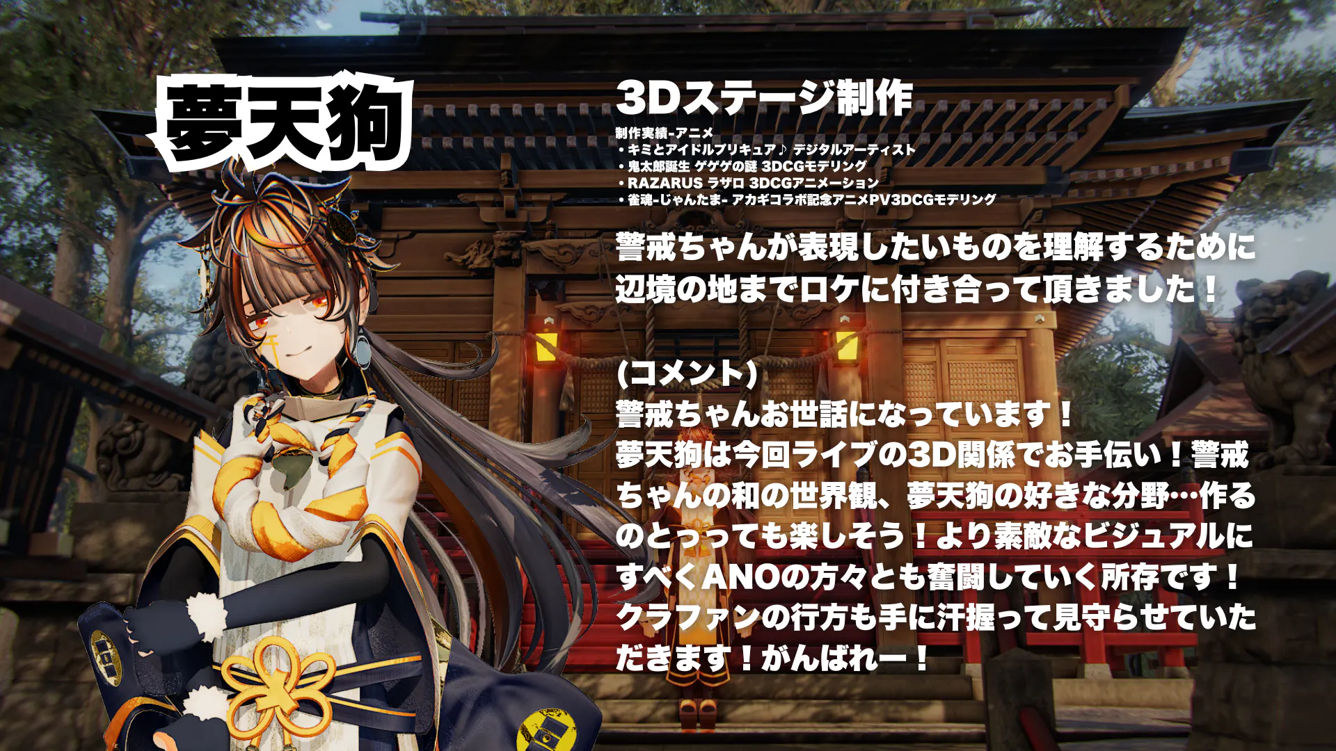 メタバースライブで表現してきた「警戒神社」を舞台に、「京甲斐村」での出来事をストーリーとして楽しんで頂けるライブを予定しています。