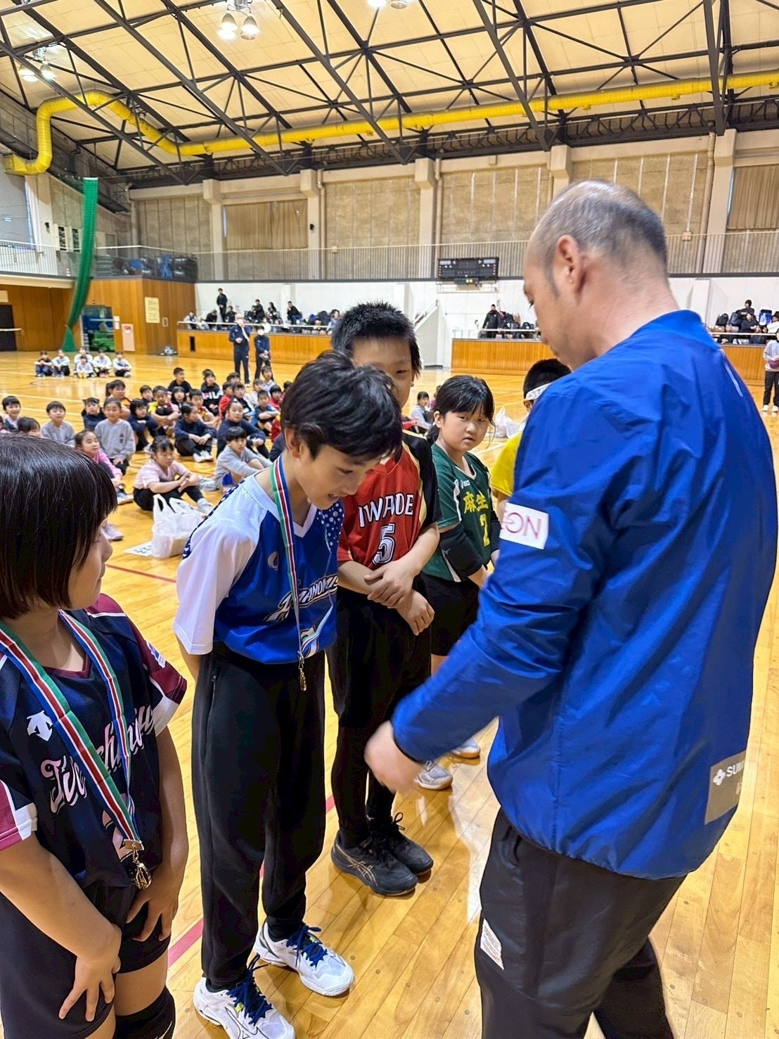 言葉の壁を超えて、バレーボールを通じて心を通わせる子どもたち。試合後にはプレゼント交換し、肩を組んで写真撮影する姿も見られました。小さな体育館から始まった私たちの活動が、