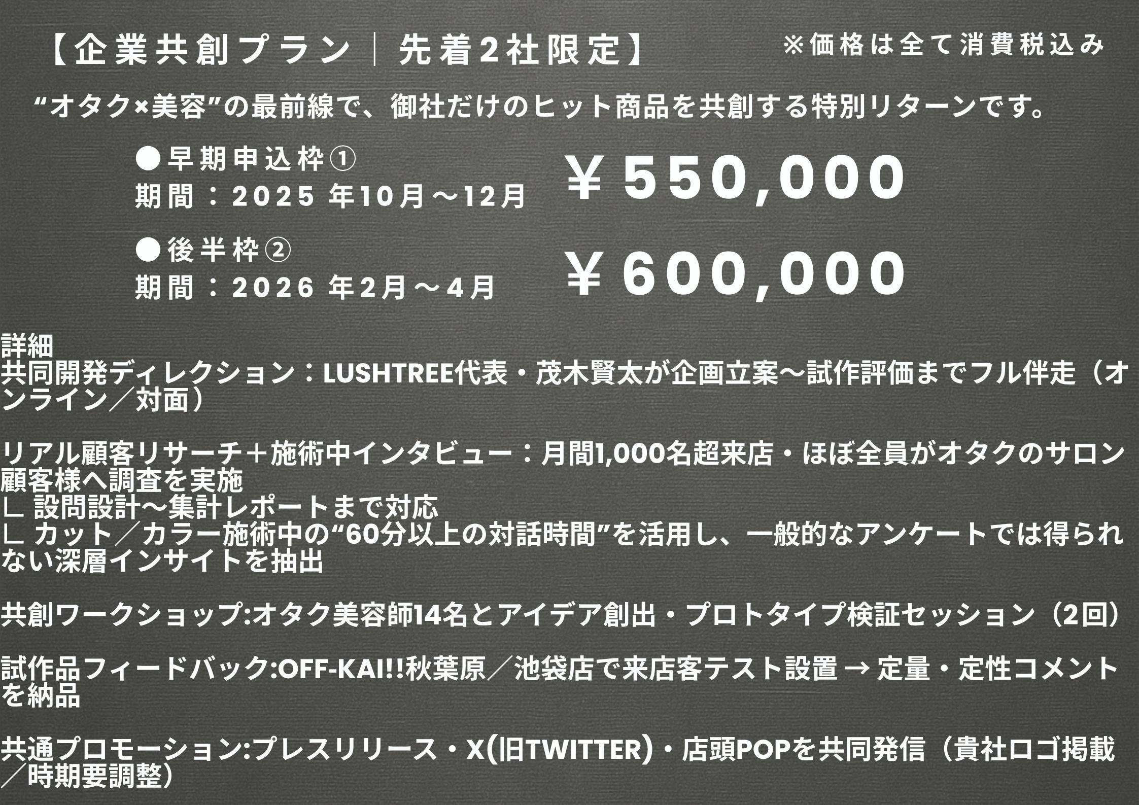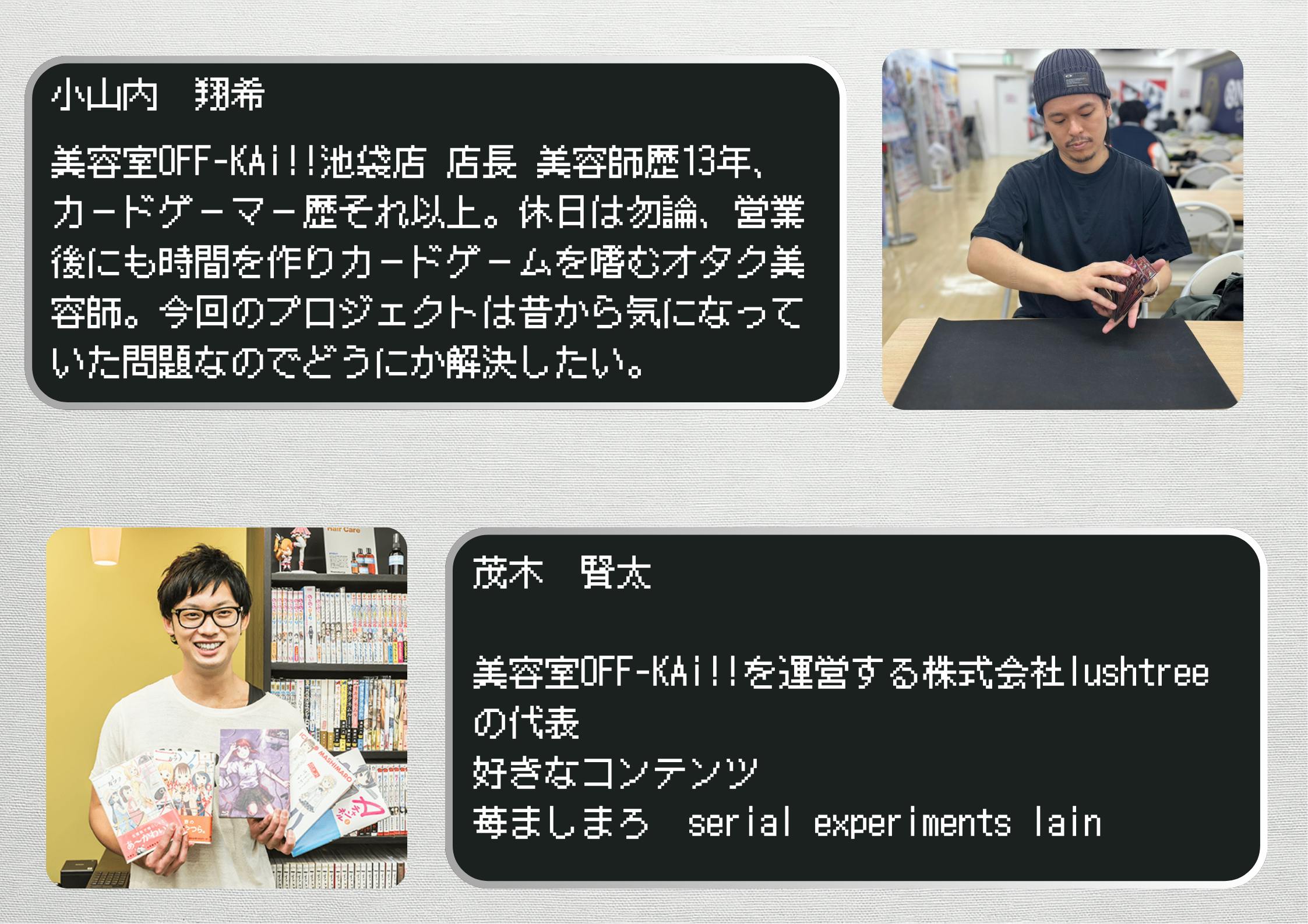 初めまして!私たちは、オタクの方向けに秋葉原と池袋にて展開しております、美容室OFF-KAi!!(オフカイ)の代表茂木と、カードゲーマーであり池袋店店長の小山内と申します。