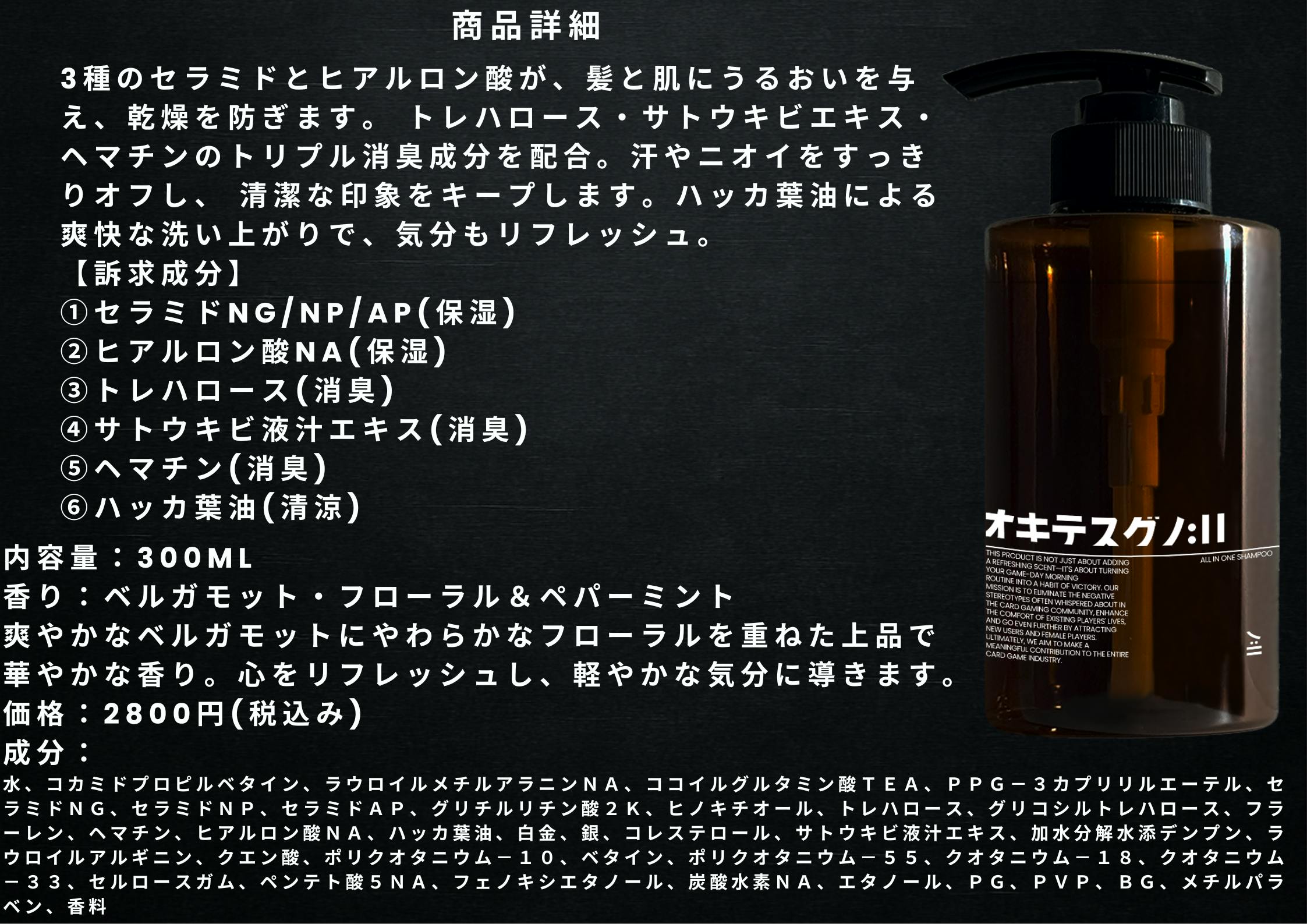 このオキテスグノ:||は髪も顔も体もこれ1本で洗えて、ニオイ・ベタつき・乾燥対策まで無駄なく清潔感をキープし、好印象な自分へと整え爽やかな香りをまとわせるだけではなく、勝負の日の朝の勝利ルーティンを習慣化し、巷でささやかれるカードゲーム界隈のネガティブな状況を取り除き、既存のカードゲーマーライフを快適にする。