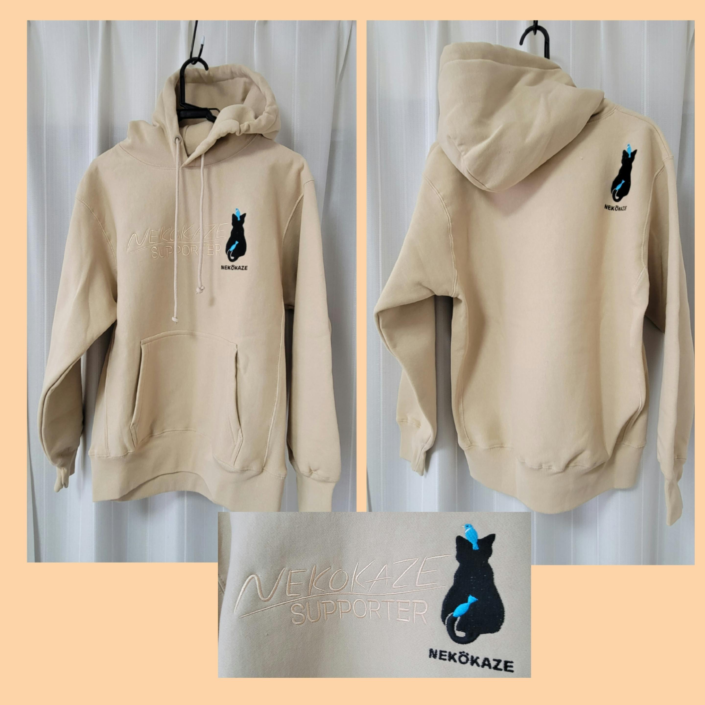 新色のパーカー、サンドベージュ。まだサンプル届いていませんが、アルファユニさんから仕上がり部分写真届きました!生地と文字、ベージュの同系色も高級感有って良いですね‼サンプル届き次第ヘザーピンクと一緒に全体デザイン写真アップします‼猫のいる風景