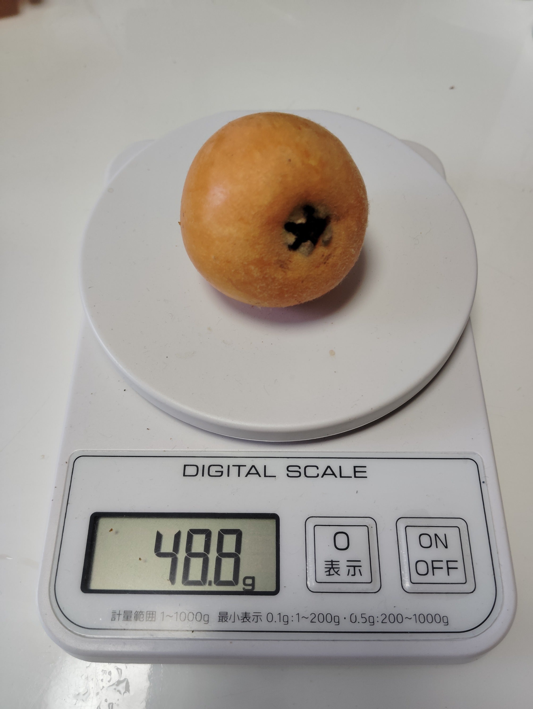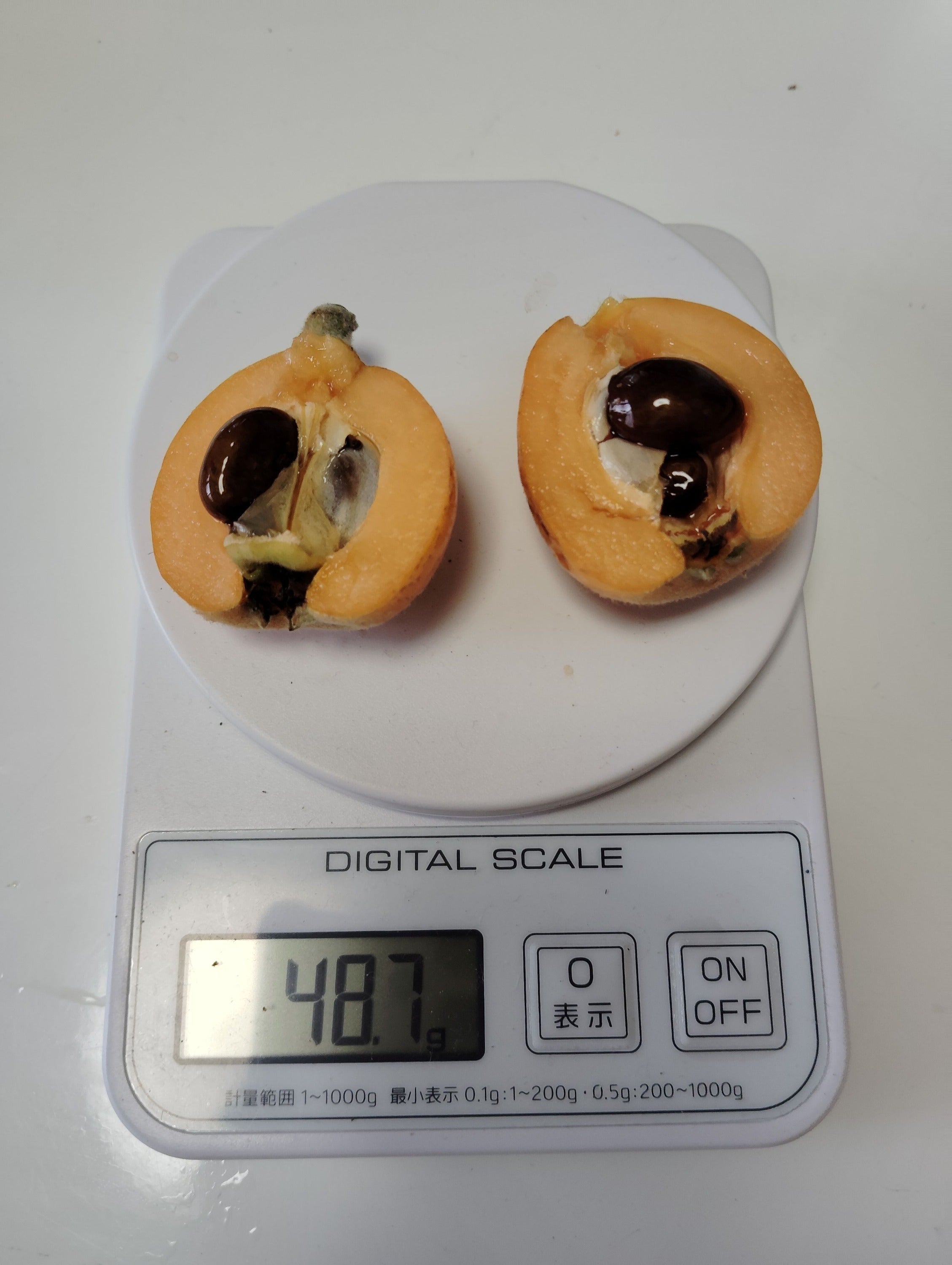 早生品種 果重:平均45g 完熟糖度:露地根域制限栽培 Brix13.6~15.3度 屈折15度 酸味:ほぼ無し 収穫時期:5月下旬~6月上旬 同条件栽培「なつたより」と比較してトロピカル感がなく、ビワ独特のクドさがないため非常に上品な味。樹形は半円形に広がり、花も摘果しやすい房となるため奇麗な果実を生産出来ます。実の形はイチジク型で現在確認された最大の大きさは63g。写真ページ 2~3