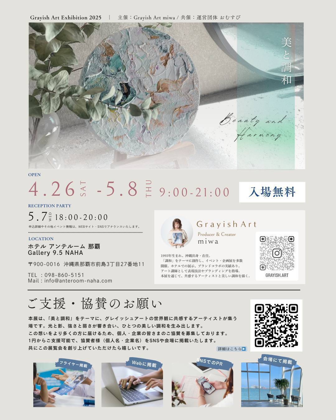 そんな中、知り合いのクリエイター・miwaさんとの出会いが、“おむすび”の第一歩となりました。 沖縄でグレイッシュアートを中心に活動するパワフルなママさんクリエイターである彼女と話していた時、ギャラリーの話をした数日後に、miwaさんが手がける展覧会開催が決まりました。