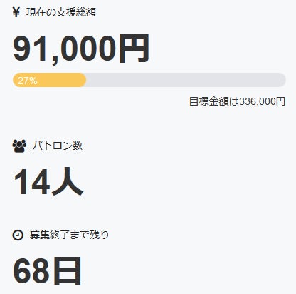 お世話になっております。 名無しの東北県人です。 本日、また新たに一名の方がパトロンとなって下さいました。 本当にありがとうございます。 現在ご支援頂いている方々は十四名+直接支援三名の合計十七名、 直接支援分を入れた達成率は32%にまで上昇致しました。 引き続き、何卒宜しくお願い致します。 名無しの東北県人