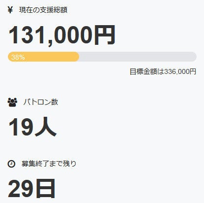 お世話になっております。 名無しの東北県人です。 本日、七人目となる最高額支援者の方がパトロンとなって下さいました。 本当にありがとうございます。 これにより現在のパトロン様は十六名+直接支援三名の合計十九名、 直接支援分を入れた達成率は38%にまで上昇致しました。 引き続き、何卒宜しくお願い致します。 名無しの東北県人