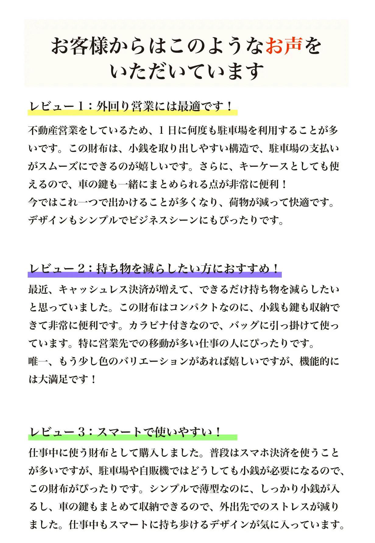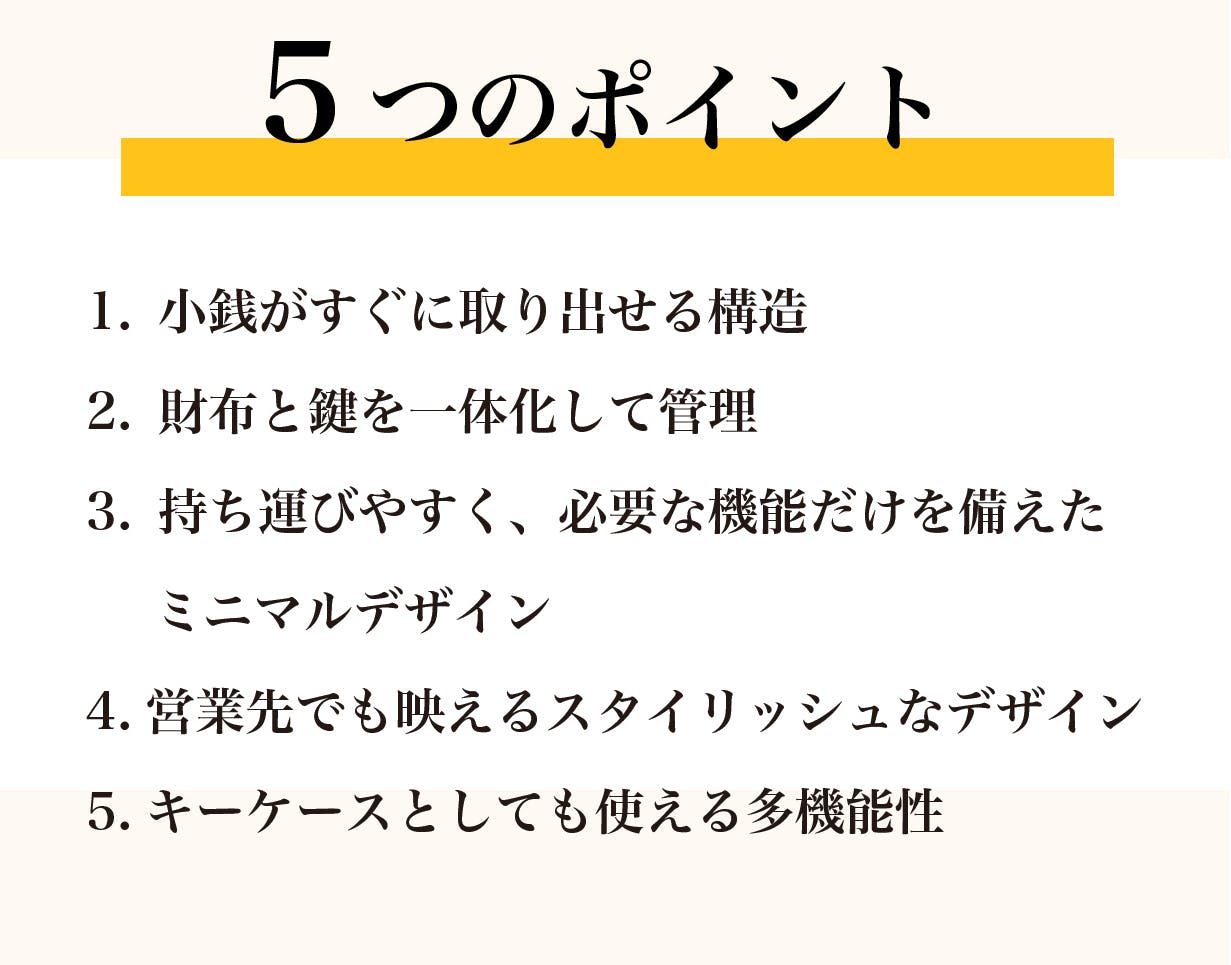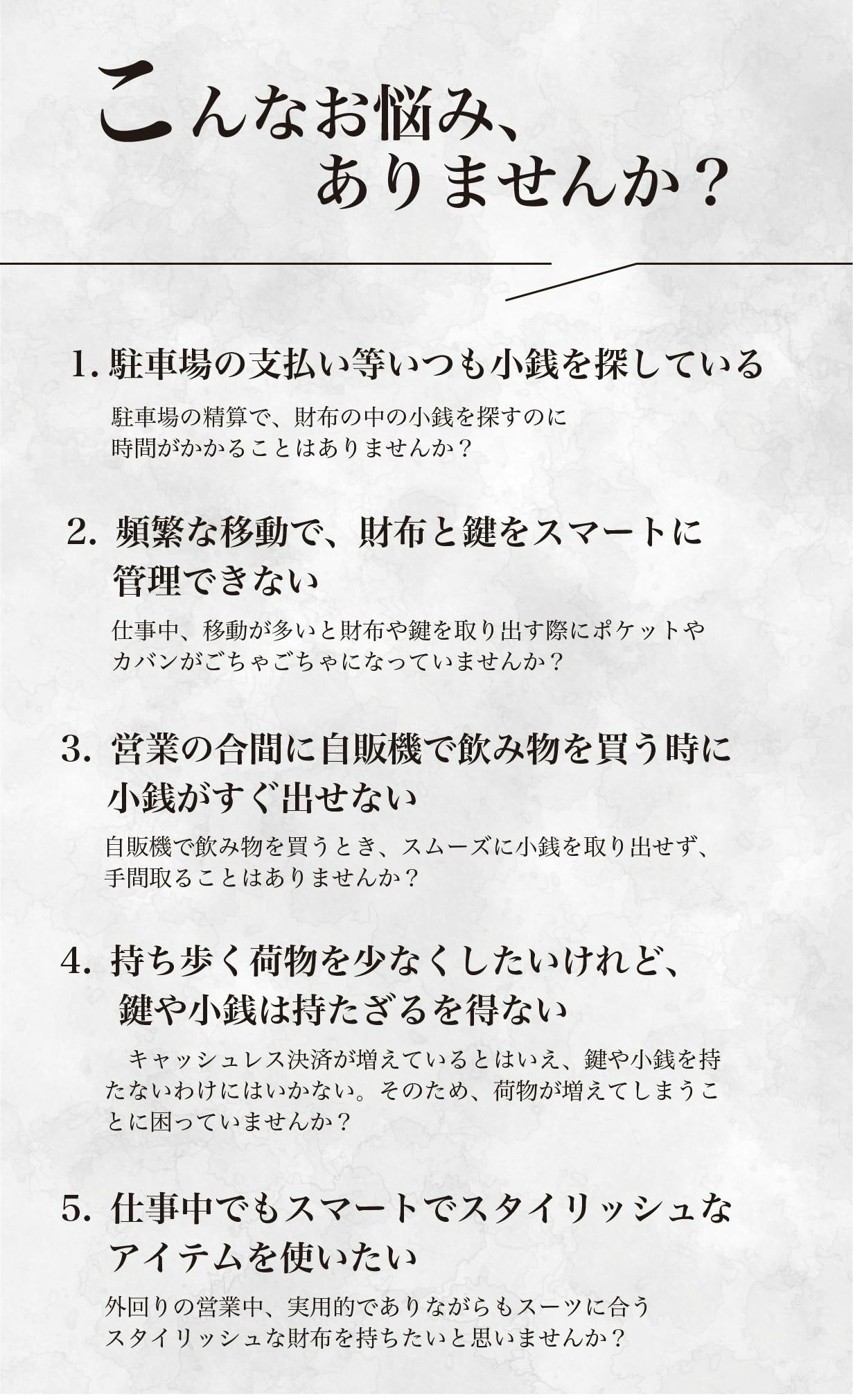 2025/06/01 11:00こんにちは!今回は、KEY×COIN WALLETの“取り出しやすさ”について、営業の現場で働く方の目線からご紹介します。たとえば、移動中の自販機での飲み物購入。あるいは取引先近くのコインパーキング。そんな場面で、もたつかずにスッと小銭を出せること。それって、意外に大事な“ビジネスマナー”だと私たちは考えています。営業マンは、いつ誰にどこで見られているかわかりません。だからこそ、財布をガサガサ探るのではなく、スマートに目的の硬貨を取り出す所作は、信頼感にもつながります。KEY×COIN WALLETは、コインポケットの口が大きく開き、硬貨の視認性と取り出しやすさを両立。片手でも操作しやすく、忙しいビジネスシーンでも頼れる存在です。ただの“財布”ではなく、あなたの印象を高める“ツール”として。そんな存在を目指して、細部まで設計しました。 もっと見る