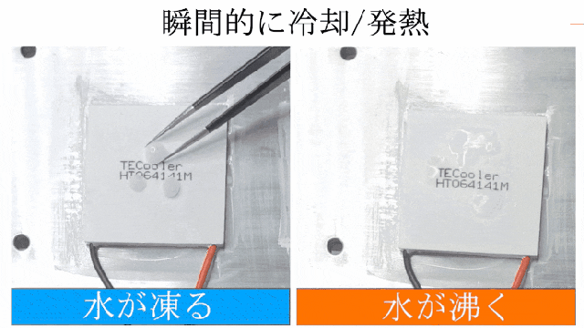 冷却、発熱は水を使って行います。温度が上がりすぎることもなく火事などの心配も少ないのが特徴。
