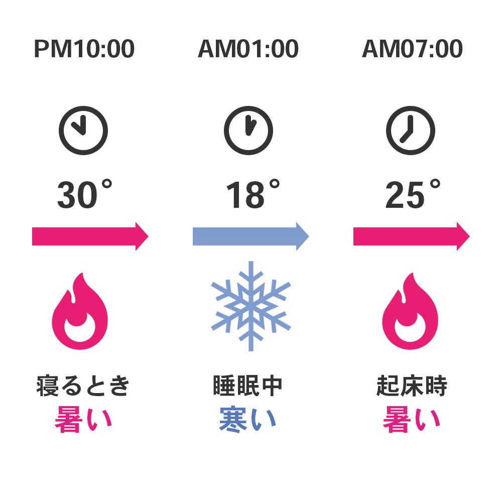 さらに、就寝中に寒くなってしまったり、朝方、暑くなってきたり、夜中の気温変化や体温状態によって快適な温度が変化します。