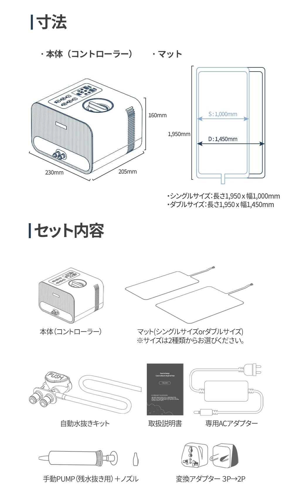 マットサイズダブル:1950×1450 mmシングル :1950×1000 mm