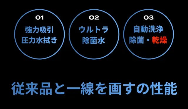 自動で洗浄、除菌、乾燥まで行えるセルフクリーニング機能。面倒な掃除後の洗浄、乾燥が不要。掃除の後は汚水を流してタンクをすすぐだけ。